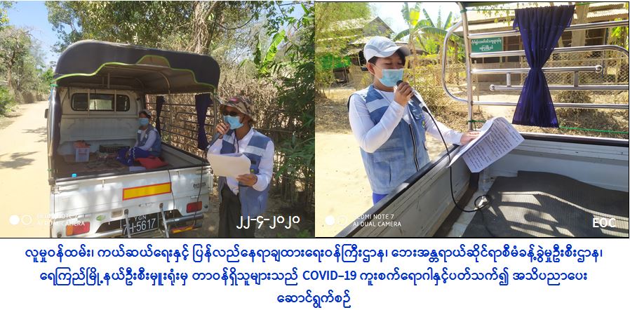 လူမှုဝန်ထမ်း၊ ကယ်ဆယ်ရေးနှင့် ပြန်လည်နေရာချထားရေးဝန်ကြီးဌာန၊ ဘေးအန္တရာယ်ဆိုင်ရာစီမံခန့်ခွဲမှုဦးစီးဌာန၊ ရေကြည်မြို့နယ်ဦးစီးမှူးရုံးမှ တာဝန်ရှိသူများသည် (၂၂-၄-၂၀၂၀) ရက်နေ့တွင် ရေကြည်မြို့နယ်၊ အသုတ်မြို့၊ တိုက်စွန်းအောက်အင်းကျေးရွာအုပ်စု၊ တိုက်စွန်းအောက်အင်းကျေးရွာ၌ (၀၉:၀၀) နာရီမှ (၁၀:၀၀) နာရီအထိလည်းကောင်း၊ ညောင်ကုန်းကျေးရွာ၌ (၁၀:၀၀) နာရီမှ (၁၀:၄၅) နာရီအထိလည်းကောင်း၊ လက်ပံစုကျေးရွာ၌ (၁၀:၃၀) နာရီမှ (၁၂:၀၀) နာရီအထိလည်းကောင်း၊ မာလာကုန်းကျေးရွာ၌ (၁၃:၀၀) နာရီမှ (၁၄:၀၀) နာရီအထိလည်း ကောင်း၊ သရက်တောကျေးရွာ၌ (၁၄:၀၀) နာရီမှ (၁၅:၃၀) နာရီအထိလည်းကောင်း၊ သဲကုန်းကျေးရွာ၌ (၁၅:၃၀) နာရီမှ (၁၆:၃၀) နာရီအထိလည်းကောင်း COVID-19 ကူးစက်ရောဂါနှင့်ပတ်သက်ပြီး ဆောင်ရန်/ရှောင်ရန်များကို ကျေးရွာ/ရပ်ကွက်နေပြည်သူတို့အား အသိပညာပေးခြင်းများ ဆောင်ရွက်ခဲ့ကြောင်း သတင်းရရှိပါသည်။