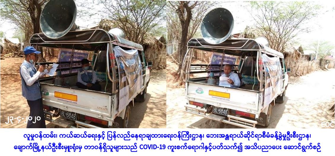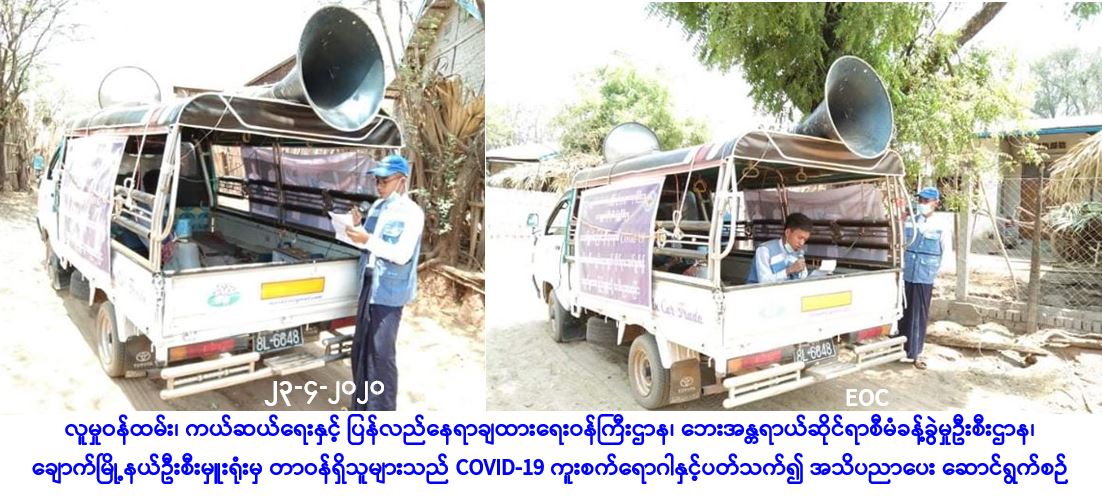 လူမှုဝန်ထမ်း၊ ကယ်ဆယ်ရေးနှင့် ပြန်လည်နေရာချထားရေးဝန်ကြီးဌာန၊ ဘေးအန္တရာယ်ဆိုင်ရာစီမံ ခန့်ခွဲမှုဦးစီးဌာန၊ ချောက်မြို့နယ်ဦးစီးမှူးရုံးမှ တာဝန်ရှိသူများသည် (၂၃-၄-၂၀၂၀) ရက်နေ့၊ (၀၈:၃၀) နာရီမှ (၁၁:၀၀) နာရီအချိန်ထိ မကွေးခရိုင်၊ ချောက်မြို့နယ်အတွင်းရှိ မင်းဒေါင့်ကျေးရွာနှင့် စမ်းနီကျေးရွာများသို့ COVID-19 ကူးစက်ရောဂါနှင့်ပတ်သက်၍ ကာကွယ်၊ တားဆီး၊ ထိန်းချုပ်၊ ကုသရေးဆိုင်ရာ ပြည်သူလူထု အသိပညာပေးပန်ကြားချက်များကို လှည့်လည်ဟောပြော ဆောင်ရွက်ခဲ့ကြောင်း သတင်းရရှိပါသည်။