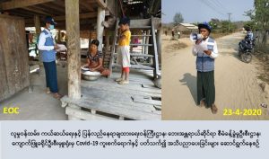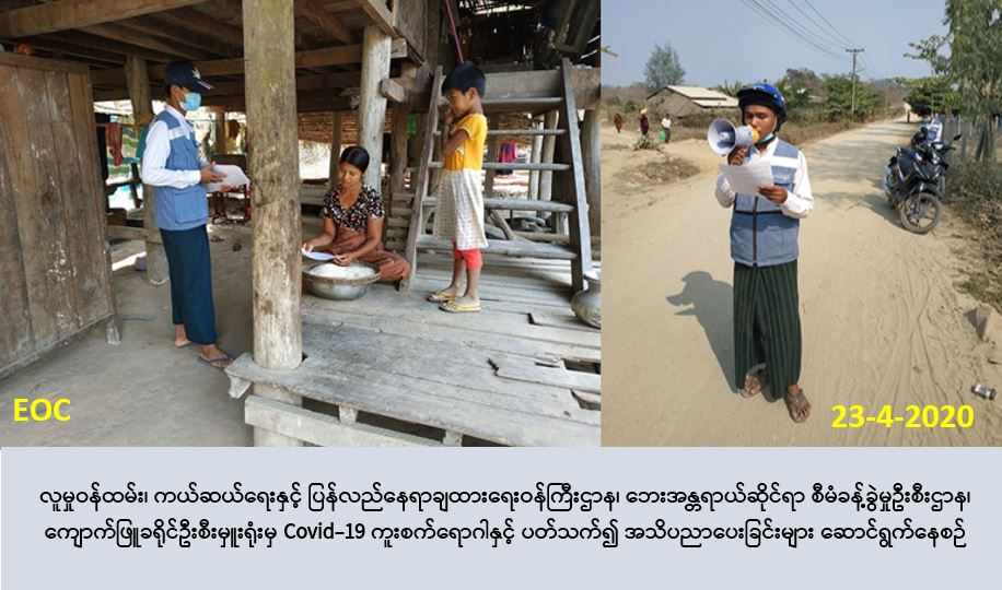 လူမှုဝန်ထမ်း၊ ကယ်ဆယ်ရေးနှင့် ပြန်လည်နေရာချထားရေးဝန်ကြီးဌာန၊ ဘေးအန္တရာယ်ဆိုင်ရာ စီမံခန့်ခွဲမှုဉီးစီးဌာန၊ ကျောက်ဖြူခရိုင်ဦးစီးမှူးရုံးမှ တာဝန်ရှိသူများသည် (၂၃-၄-၂၀၂၀)ရက်နေ့ ၊ နံနက်(၀၈:၃၀) အချိန်မှ (၀၉:၃၀)အချိန်အထိ ကျောက်ဖြူမြို့နယ်၊ ဇိုင်ချောင်းကျေးရွာတွင် COVID-19 ရောဂါ နှင့်ပတ်သက်၍ ဆောင်ရန်၊ရှောင်ရန်များအား သိရှိလိုက်နာဆောင်ရွက်နိုင်ရန် လက်ကမ်းစာစောင်များဖြန့်ဝေခြင်း Hand Speaker ဖြင့် လိုက်လံနှိုးဆော်ခြင်းတို့ကို ဆောင်ရွက်ခဲ့ပါသည်။