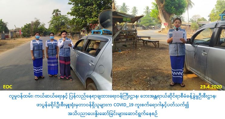 လူမှုဝန်ထမ်း၊ ကယ်ဆယ်ရေးနှင့် ပြန်လည်နေရာချထားရေးဝန်ကြီးဌာန၊ ဘေးအန္တရာယ်ဆိုင်ရာစီမံခန့်ခွဲမှုဦးစီးဌာန၊ ဖာပွန်ခရိုင်ဦးစီးမှူးရုံးမှ တာဝန်ရှိသူများသည် (၂၃-၄-၂၀၂၀) ရက်နေ့၊ နံနက်(၀၉:၀၀)နာရီမှ (၁၂:၀၀)နာရီအချိန်ထိ ဖာပွန်မြို့နယ်ရှိ တံခွန်တိုင်ကျေးရွာ၊ ဝှေမှုန်ကျေးရွာ နှင့် ဝှေဆန်ကျေးရွာတို့တွင် COVID-19 ရောဂါပျံ့နှံ့မှုများမဖြစ်ပွားစေရန်အတွက် အသံချဲ့စက်ဖြင့် အသိပညာပေးဟောပြောခြင်းများ ဆောင်ရွက်ခဲ့ပါကြောင်း သတင်းရရှိပါသည်။
