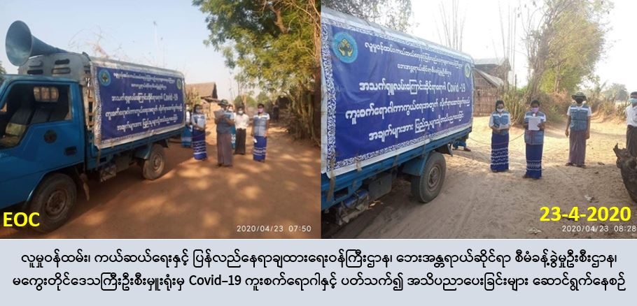 လူမှုဝန်ထမ်း၊ ကယ်ဆယ်ရေးနှင့် ပြန်လည်နေရာချထားရေးဝန်ကြီးဌာန၊ ဘေးအန္တရာယ်ဆိုင်ရာ စီမံခန့်ခွဲမှုဉီးစီးဌာန၊ မကွေးတိုင်းဒေသကြီးဦးစီးမှူးရုံးမှ တာဝန်ရှိသူများသည် (၂၃-၄-၂၀၂၀) ရက် နေ့၊ နံနက်(၀၇:၀၀)နာရီအချိန်မှ စတင်ပြီး မကွေးမြို့နယ်၊ သပြေစမ်း(တောင်)ကျေးရွာ၊ သပြေ စမ်း(မြောက်)ကျေးရွာနှင့် စမ်းရိုးကျေးရွာများသို့ လှည့်လည်ပြီး COVID -19 ကူးစက်ရောဂါ နှင့်ပတ်သက်၍ ဆောင်ရန်/ ရှောင်ရန်တို့ကို ရပ်ကွက်အုပ်ချုပ်ရေးမှူးများ၊ ကျန်းမာရေးဦးစီး ဌာနတို့နှင့်အတူ ပူးပေါင်း၍ ရပ်ကွက်/ ကျေးရွာနေပြည်သူတို့အား အသိပညာပေး ဟောပြော ဆောင်ရွက်ခဲ့ကြောင်း သတင်းရရှိပါသည်။
