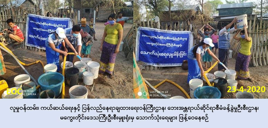 လူမှုဝန်ထမ်း၊ ကယ်ဆယ်ရေးနှင့် ပြန်လည်နေရာချထားရေးဝန်ကြီးဌာန၊ ဘေးအန္တရာယ်ဆိုင်ရာ စီမံခန့်ခွဲမှုဉီးစီးဌာန၊ မကွေးတိုင်းဒေသကြီးဦးစီးမှူးရုံးမှ တာဝန်ရှိသူများသည် သောက်သုံးရေ ခက်ခဲသော မကွေးမြို့နယ်၊ ကြာကန်ကျေးရွာအုပ်စု၊ ကြာကန်ကျေးရွာ (တောင်ပိုင်း၊ အနောက်ပိုင်း) နှင့် ဦးကျော်စိန်(တဲတိုက်)ရှိ အိမ်ခြေ (၁၀၃) လုံး၊ အိမ်ထောင် စု(၁၁၇) စု၊ လူဦးရေ (၅၁၈) ဦးတို့အတွက် သောက်သုံးရေဂါလံ (၆၀၀၀) အား ( ၂၃- ၄-၂၀၂၀) ရက်နေ့၊ ( ၁၁ : ၀၀ ) နာရီအချိန်တွင် သွားရောက်ဖြန့်ဝေပေးခဲ့ပါကြောင်း သတင်းရရှိပါသည်။