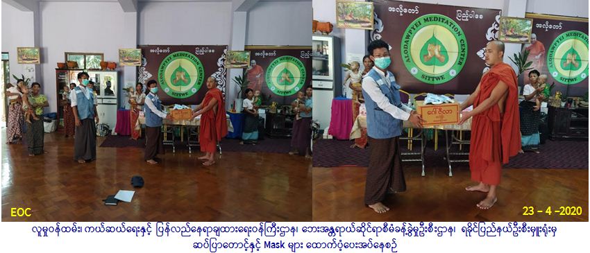 လူမှုဝန်ထမ်း၊ ကယ်ဆယ်ရေးနှင့် ပြန်လည်နေရာချထားရေးဝန်ကြီးဌာန၊ ဘေးအန္တရာယ်ဆိုင်ရာစီမံခန့်ခွဲမှုဦးစီးဌာန၊ ရခိုင် ပြည်နယ်ဦးစီးမှူးရုံးမှ တာဝန်ရှိသူများသည် စစ်တွေမြို့၊ အလိုတော်ပြည့်ဘုန်းတော်ကြီးကျောင်း၌ ခိုလှုံလျက်ရှိသော တိုက်ပွဲ ရှောင်အိမ်ထောင်စု (၅၃) စုအတွက် ဆပ်ပြာ (၅၃)တောင့်နှင့် Mask (၁၀၆)ခုအား (၂၃–၄–၂၀၂၀)ရက်နေ့၊ (၁၆:၃၀) နာရီအချိန်တွင် ပေးအပ်ထောက်ပံ့ခဲ့ပါကြောင်း သတင်းရရှိပါသည်။