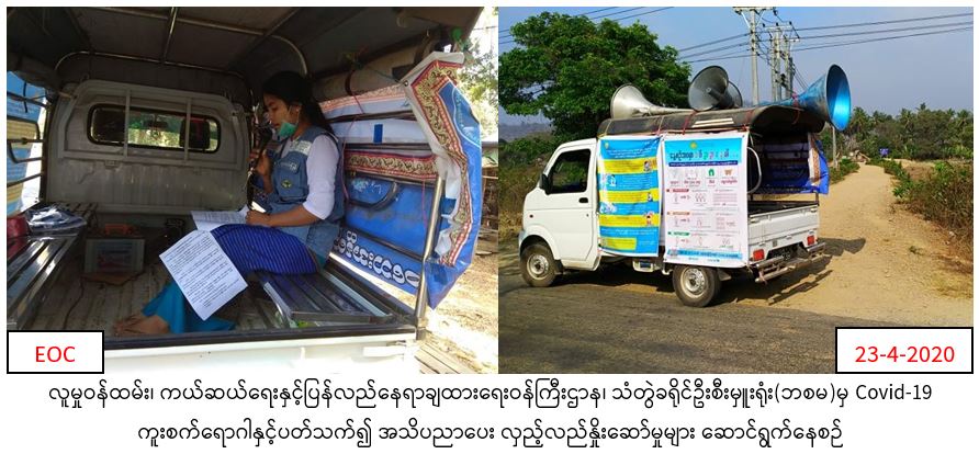လူမှုဝန်ထမ်း၊ ကယ်ဆယ်ရေးနှင့်ပြန်လည်နေရာချထားရေးဝန်ကြီးဌာန၊ ဘေးအန္တရာယ်ဆိုင်ရာစီမံခန့်ခွဲမှုဦးစီးဌာန၊ ရခိုင်ပြည်နယ်၊ သံတွဲခရိုင်ဦးစီးမှူးရုံးမှ တာဝန်ရှိသူများသည် ခရိုင် / မြို့နယ်အထွေထွေအုပ်ချုပ်ရေးဦးစီးဌာန၊ သံတွဲမြို့နယ်၊ သိမ်ကုန်းကျောင်းနာယကဆရာတော်၊ BHN Association INGO(ဂျပန်)တို့နှင့် ပူးပေါင်း၍(၂၃- ၄- ၂၀၂၀)ရက်နေ့တို့တွင် နံနက်(၁၀း၄၅)အချိန်မှ(၁၁း၄၅)အချိန်ထိ သံတွဲခရိုင်၊ ဂွမြို့နယ်၊ ချင်းကွင်းကျေးရွာတွင်လည်းကောင်း၊ နေ့လည်(၁၂း၀၀)မှ(၁၂း၃၀)ထိ သံတွဲခရိုင်၊ ဂွမြို့နယ်၊ ကိုင်းတောကွင်းကျေးရွာတွင် လည်းကောင်း Covid-19ကူးစက်ရောဂါ ကာကွယ်၊ တားဆီး၊ ထိန်းချုပ်၊ ကုသရေးဆိုင်ရာပန်ကြားချက်များအား ပြည်သူလူထုသို့ အသိပညာပေးလှည့်လည် ဟောပြောခြင်းနှင့် လက်ကမ်းစာစောင်ဖြန့်ဝေပေးခြင်းများ ဆောင်ရွက်ခဲ့ကြောင်း သတင်းရရှိပါသည်။