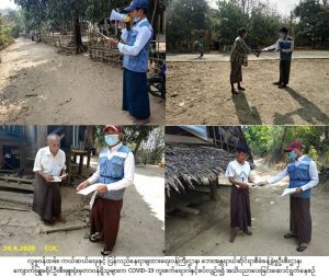 လူမှုဝန်ထမ်း၊ ကယ်ဆယ်ရေးနှင့် ပြန်လည်နေရာချထားရေးဝန်ကြီးဌာန၊ ဘေးအန္တရာယ်ဆိုင်ရာစီမံခန့်ခွဲမှုဦးစီး ဌာန၊ ကျောက်ဖြူခရိုင်ဦးစီးမှူးရုံးမှတာဝန်ရှိသူများသည် (၂၄-၄-၂၀၂၀) ရက်နေ့၊ (၀၉:၃၀) နာရီအချိန်မှ (၁၀:၃၀) နာရီအချိန်အထိ ကျောက်ဖြူမြို့နယ်၊ သိုင်းချောင်းကျေးရွာ၌ COVID-19 ကူးစက်ရောဂါနှင့်စပ်လျဉ်း၍ ဆောင်ရန်/ရှောင်ရန်အချက်များကို Hand Speaker ဖြင့် လှည့်လည်အသိပညာပေးနှိုးဆော်ခဲ့ပြီး လက်ကမ်းစာစောင်များဖြန့်ဝေခဲ့ပါကြောင်း သတင်းရရှိပါသည်။