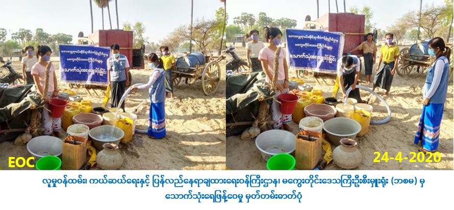 လူမှုဝန်ထမ်း၊ ကယ်ဆယ်ရေးနှင့် ပြန်လည်နေရာချထားရေး၀န်ကြီးဌာန၊ ဘေးအန္တရာယ်ဆိုင်ရာစီမံ ခန့်ခွဲမှုဦးစီးဌာန၊ မကွေးတိုင်းဒေသကြီးဦးစီးမှူးရုံးမှ တာဝန်ရှိသူများသည် (၂၄-၄-၂၀၂၀) ရက်နေ့၊ (၁၁:၀၀) နာရီအချိန်တွင် သောက်သုံးရေခက်ခဲသော မကွေးမြို့နယ်၊ ကြာကန်ကျေးရွာအုပ်စု၊ ကြာကန်ကျေးရွာ(အရှေ့ပိုင်း)၊ ဦးဝဲ(တဲတိုက်)၊ ဦးအုန်းသီး(တဲတိုက်)နှင့် အောင်ချမ်းသာကွက်သစ်ရှိ အိမ်ခြေ (၁၁၄) လုံး၊ အိမ်ထောင် စု(၁၂၃) စု၊ လူဦးရေ (၅၇၉) ဦးတို့အတွက် သောက်သုံးရေဂါလံ (၆၀၀၀) အား သွားရောက်ဖြန့်ဝေပေးခဲ့ကြောင်း သတင်းရရှိပါသည်။