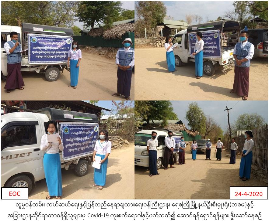 လူမှုဝန်ထမ်း၊ ကယ်ဆယ်ရေးနှင့်ပြန်လည်နေရာချထားရေးဝန်ကြီးဌာန၊ ဘေးအန္တရာယ်ဆိုင်ရာစီမံခန့်ခွဲမှုဦးစီးဌာန၊ ရေစကြိုမြို့နယ်ဦးစီးမှူးရုံးမှ တာဝန်ရှိသူများသည် (၂၄.၄.၂၀၂၀) ရက်နေ့ တွင် (၀၉း၀၀)နာရီမှစတင်၍ (၁၂း၀၀)အချိန်ထိ ရေစကြိုမြို့နယ်၊ ကြက်ဆူကျင်းကျေးရွာအုပ်စု၊ ကြက်ဆူကျင်းကျေးရွာနှင့် ကျောက်ဖူးကျေးရွာတို့တွင် လူမှုဝန်ထမ်းဦးစီးဌာန၊ ရင်ခွင်မဲ့ကလေးငယ်များလျော့ချရေးနှင့် ကာကွယ်စောင့်ရှောက်ရေးအသင်း၊ လူငယ်လုပ်ငန်းအဖွဲ့တို့နှင့် ပူးပေါင်းကာ COVID-19ရောဂါ ကူးစက်ပျံ့နှံ့မှုများ မဖြစ်ပွားစေရန်အတွက် သိရှိလိုက်နာဆောင်ရွက်ရန်များကို လော်စပီကာဖြင့် အသိပညာပေး ဆောင်ရွက်ခဲ့ကြောင်း သတင်းရရှိပါသည်။