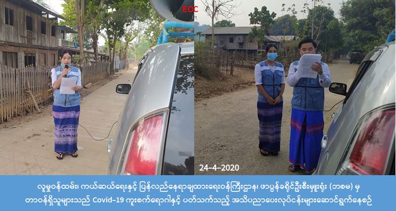 လူမှုဝန်ထမ်း၊ ကယ်ဆယ်ရေးနှင့် ပြန်လည်နေရာချထားရေးဝန်ကြီးဌာန၊ ဘေးအန္တရာယ်ဆိုင်ရာ စီမံခန့်ခွဲမှုဦးစီး ဌာန၊ ဖာပွန်ခရိုင်ဦးစီးမှူးရုံးမှ တာဝန်ရှိသူများသည် (၂၄-၄-၂၀၂၀) ရက်နေ့၊ နံနက်(၀၉:၀၀) နာရီမှ (၁၂:၀၀) နာရီ အချိန်ထိ ဖာပွန်မြို့နယ်ရှိ ရှမ်းကိုင်းကျေးရွာ၊ ကူးဆိပ်ကျေးရွာနှင့် မထောကျေးရွာတို့တွင် COVID -19 ရောဂါ ပျံ့နှံ့မှုများမဖြစ်ပွားစေရန်အတွက် အသံချဲ့စက်ဖြင့် အသိပညာပေးဟောပြောခြင်းများ ဆောင်ရွက်ခဲ့ကြောင်း သိရှိရပါသည်။