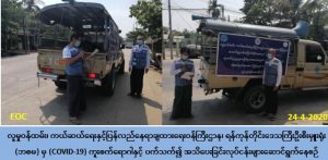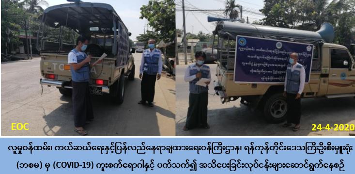 Covid19 အသက်ရှူလမ်းကြောင်းဆိုင်ရာ ရောဂါနှင့်ပတ်သက်၍ အများပြည်သူများသိရှိ လိုက်နာရန်အချက်များအား ကွင်းဆင်း၍ ကျန်းမာရေးနှင့်အားကစားဝန်ကြီးဌာနမှ ထုတ်ပြန် ထားသော အသိပေးကြေငြာချက်များအား အရာထမ်းအမှုထမ်းများမှ ရပ်ကွက်များ အတွင်း သက်ဆိုင်ရာကျန်းမာရေးဦးစီးဌာန၊ အထွေထွေအုပ်ချုပ်ရေးဦးစီးဌာန၊ မီးသတ်ဦးစီးဌာန၊ ကြက်ခြေနီအသင်း၊ လူမှုရေးအသင်းဖွဲ့များမှ တာဝန်ရှိသူများနှင့်အတူ အသိပညာပေးကြော် ငြာခြင်း၊ ပိုစတာများကပ်ခြင်းတို့ ပြုလုပ်ခဲ့ပါကြောင်း သတင်းရရှိပါသည်။