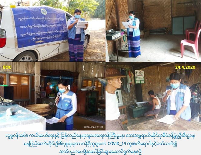 လူမှုဝန်ထမ်း၊ ကယ်ဆယ်ရေးနှင့် ပြန်လည်နေရာချထားရေးဝန်ကြီးဌာန၊ ဘေးအန္တရာယ်ဆိုင်ရာစီမံခန့်ခွဲမှုဦးစီးဌာန၊ ပြည်ထောင်စုနယ်မြေ၊ နေပြည်တော်တိုင်းဦးစီးမှူးရုံးမှ တာဝန်ရှိသူများသည် (၂၄-၄-၂၀၂၀) ရက်နေ့ နံနက် (၁၀:၀၀) အချိန်မှ ညနေ (၁၅:၃၀) အချိန်အထိ ပြည်သူများအား COVID-19 ရောဂါကူးစက်ပြန့်နှံ့မှုများ မဖြစ်ပွားစေရန် သိရှိလိုက်နာ ဆောင်ရွက်ရမည့်အချက်များနှင့် ပတ်သက်၍ အသိပညာပေးခြင်းကို ပျဉ်းမနား မြို့နယ်၊ ကျွန်းဦးကျေးရွာ၊ သစ်ဆိမ့်ပင်ကျေးရွာ၊ ကူးတို့ဆိပ်ကျေးရွာ၊ ဝဲကြီးကျေးရွာ၊ ကံဦး ကျေးရွာ၊ ဇီးရိုင်းကျေးရွာများအတွင်းရှိ ပြည်သူများသို့ ထိရောက်စွာ လိုက်လံအသိပေး ဆောင်ရွက်ခဲ့ပါကြောင်း သတင်းရရှိပါသည်။