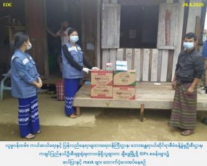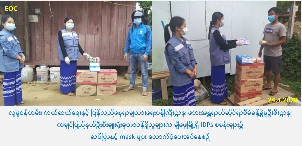 လူမှုဝန်ထမ်း၊ ကယ်ဆယ်ရေးနှင့် ပြန်လည်နေရာချထားရေးဝန်ကြီးဌာန၊ ဘေးအန္တရာယ်ဆိုင်ရာစီမံခန့်ခွဲမှုဦးစီးဌာန၊ ကချင်ပြည်နယ်ဦးစီးမှူးရုံးမှ တာဝန်ရှိသူများသည် (၂၄-၄-၂၀၂၀) ရက်နေ့တွင် Covid-19 ကူးစက်ရောဂါနှင့် ပတ်သက်၍ ဝိုင်းမော်မြို့နယ်၊ ချီဖွေမြို့ရှိ၊ အမှတ်(၁) IDPs စခန်းနှင့် အမှတ်(၂) IDPs စခန်းအတွင်းရှိ အိမ်ထောင်စု (၃၁၂)စု အတွက် အိမ်ထောင်စုတစ်စုလျင် ဆပ်ပြာ(၂)ခဲ၊ mask (၂)ခုနှုန်းဖြင့် ဆပ်ပြာ(၆၂၄)ခဲနှင့် mask (၆၂၄) ခု တို့အား သွားရောက်ထောက်ပံ့ပေးအပ်ခဲ့ပါကြောင်း သတင်းရရှိပါသည်။
