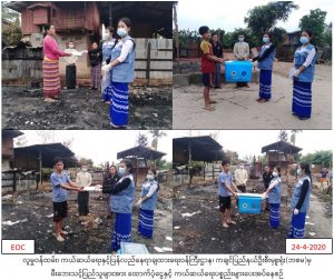 လူမှုဝန်ထမ်း၊ ကယ်ဆယ်ရေးနှင့် ပြန်လည်နေရာချထားရေးဝန်ကြီးဌာန၊ ဘေးအန္တရာယ်ဆိုင်ရာစီမံခန့်ခွဲမှုဦးစီးဌာန၊ ကချင်ပြည်နယ်ဦးစီးမှူးရုံးမှ တာဝန်ရှိသူများသည် မြစ်ကြီးနားခရိုင်၊ ဝိုင်းမော်မြို့၊ အမှတ်(၂)ရပ်ကွက်၊ ခါ့တန်ရပ်၌ (၂၁-၄-၂၀၂၀)ရက်နေ့တွင် ဖြစ်ပွားခဲ့သော မီးဘေးကြောင့် လုံးဝပျက်စီးအိမ်ထောင်စု(၁)စု၊ လူဦးရေ(၄)ဦးတို့အတွက် ကယ်ဆယ်ရေးပစ္စည်း(၁၇)မျိုး၊ (၁)အိမ်ထောင်စုစာ၊ ဆန်ရိက္ခာ(၇)ရက်စာဖိုး(၈,၄၀ဝိ/-)ကျပ်နှင့် အိမ်ဆောက်ပစ္စည်းဖိုး(၂၀၀,၀၀ဝိ/-)၊ တစိတ်တပိုင်းပျက်စီးအိမ်ထောင်စု(၁)စု၊ လူဦးရေ(၃)ဦးတို့အတွက် ကယ်ဆယ်ရေးပစ္စည်း(၁၀)မျိုး၊ အိမ်ထောင်စု(၁)စုစာ၊ ဆန်ရိက္ခာ(၇)ရက်စာဖိုး(၆,၃၀ဝိ/-)နှင့် အိမ်ဆောက်ပစ္စည်းဖိုး(၃၀,၀၀ဝိ/-)၊ စပါးကျီအနည်းငယ်မီးကူးစက်လောင်ကျွမ်းခဲ့သော အိမ်ထောင်စု(၁)စု၊ လူဦးရေ(၆)ဦးတို့အတွက် ဆန်ရိက္ခာ(၇)ရက်စာဖိုး (၁၂,၆၀ဝိ/-)၊ စုစုပေါင်းတန်ဖိုး(၂၅၆၃၀ဝိ/-)ကျပ်အား (၂၄-၄-၂၀၂၀)ရက်နေ့ (၁၅:၃၀)နာရီအချိန်တွင် မီးဘေးသင့်ပြည်သူများလက်ဝယ်အရောက် သွားရောက်ထောက်ပံ့ပေးအပ်ခဲ့ကြောင်း သတင်းရရှိပါသည်။
