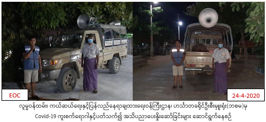 လူမှုဝန်ထမ်း၊ ကယ်ဆယ်ရေးနှင့်ပြန်လည်နေရာချထားရေးဝန်ကြီးဌာန၊ ဘေးအန္တရာယ်ဆိုင်ရာစီမံခန့်ခွဲမှုဦးစီးဌာန၊ ဟင်္သာတခရိုင်ဦးစီးမှူးရုံးမှ တာဝန်ရှိသူများသည် (၂၄- ၄-၂၀၂၀) ရက်နေ့ ည (၂၀:၀၀)နာရီအချိန်မှ စတင်ပြီး ဟင်္သာတမြို့နယ်၊ ရွာသစ်အုပ်စု(ရွာသစ်တောင်/မြောက်၊ အင်ဂပို၊ မကျီးကုန်း၊ တာဂွ)ရွာများနှင့် လယ်တီအုပ်စု၊ လယ်တီရွာ၊ မြဝတီရပ်ကွက်၊ ပျဉ်းမချောင်းရပ်ကွက်တို့တွင် လှည့်လည်ပြီး လတ်တလောဖြစ်ပွါးလျှက်ရှိသော COVID -19 ကူးစက်ရောဂါနှင့်ပတ်သက်ပြီး ဆောင်ရန်/ရှောင်ရန် များအား ရပ်ကွက်/ကျေးရွာနေပြည်သူတို့အား အသိပညာပေးဟောပြောဆောင်ရွက်ခဲ့ကြောင်း သတင်းရရှိပါသည်။