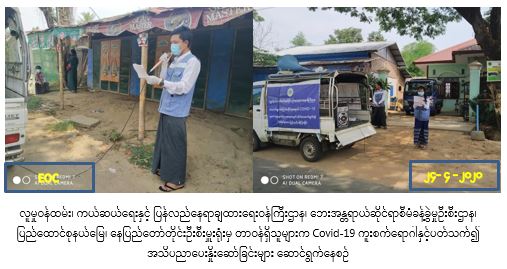 လူမှုဝန်ထမ်း၊ ကယ်ဆယ်ရေးနှင့် ပြန်လည်နေရာချထားရေးဝန်ကြီးဌာန၊ ဘေးအန္တရာယ်ဆိုင်ရာစီမံ ခန့်ခွဲမှုဉီးစီးဌာန၊ ပြည်ထောင်စုနယ်မြေ၊ နေပြည်တော်တိုင်းဦးစီးမှူးရုံးမှ တာဝန်ရှိသူများသည် (၂၄.၄.၂၀၂၀) ရက်နေ့၊ နံနက်(၀၉:၃၀) အချိန်မှ ညနေ (၁၅:၀၀) နာရီအချိန်ထိ လယ်ဝေးမြို့နယ်၊ စည်ပိုင်းကျေးရွာအုပ်စု၊ စည်ပိုင်းကျေးရွာ၊ ကြို့ပင်ကျေးရွာ၊ ချင်းစာကျေးရွာများသို့ သွားရောက်ပြီး COVID – 19 ရောဂါကူးစက်ပျံ့နှံ့မှုများနှင့် ပတ်သက်၍ အသိပညာပေးဟောပြောမှုများ ဆောင်ရွက်ခဲ့ကြောင်း သတင်းရရှိပါသည်။