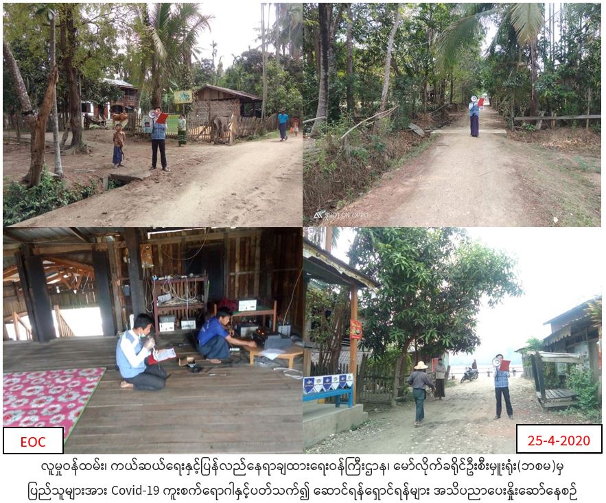လူမှုဝန်ထမ်း၊ ကယ်ဆယ်ရေးနှင့်ပြန်လည်နေရာချထားရေးဝန်ကြီးဌာန၊ ဘေးအန္တရာယ်ဆိုင်ရာစီမံခန့်ခွဲမှုဦးစီးဌာန၊ မော်လိုက်ခရိုင်ဉီးစီးမှူးရုံးမှ တာဝန်ရှိသူများသည် (၂၅.၄.၂၀၂၀)ရက်နေ့တွင် ကြာအင်းစံပြကျေးရွာ၊ သစ်ဖြူကိုင်းကျေးရွာ၊ နန်းစောက်စောက်ကျေးရွာစသည့် ကျေးရွာများတွင် COVID.19 ရောဂါကူးစက်ပြန့်ပွါးမှုမရှိစေရေး ပြည်သူများအလွယ်တကူသိစေနိုင်ရေး ဆောင်ရန်ရှောင်ရန်အချက်များအား အသိပညာပေးလှည့်လည်နိုးဆော်ခဲ့ကြောင်း သတင်းရရှိပါသည်။