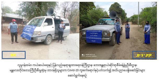 လူမှု၀န်ထမ်း၊ကယ်ဆယ်ရေးနှင့်ပြန်လည်နေရာချထား ရေး၀န်ကြီးဌာန၊ ဘေးအန္တရာယ်ဆိုင်ရာစီမံခန့်ခွဲမှုဦးစီးဌာန၊ မန္တလေးတိုင်းဒေသကြီးဦးစီးမှူးရုံးမှ တာ၀န်ရှိသူများသည် (၂၄.၄.၂၀၂၀) ရက်နေ့တွင် ငါန်းဇွန်မြို့နယ်အတွင်းရှိ ရပ်ကွက်၊ ကျေးရွာအုပ်စု၊ ကျေးရွာများတွင် COVID-19 ကူးစက်ရောဂါနှင့် ပတ်သက်သည့် ဆောင်ရန်/ရှောင်ရန်များကို အသံချဲ့စက်များဖြင့် အသိပညာပေးလုပ်ငန်းများအား ဆောင်ရွက်ခဲ့ကြောင်း သတင်းရရှိပါသည်။