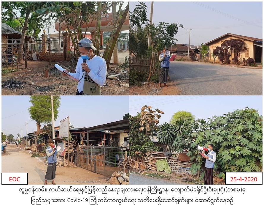 လူမူဝန်ထမ်း၊ ကယ်ဆယ်ရေးနှင့်ပြန်လည်နေရာချထားရေးဝန်ကြီးဌာန၊ ဘေးအန္တရာယ်ဆိုင်ရာစီမံခန့်ခွဲမှုဦးစီးဌာန၊ ကျောက်မဲခရိုင်ဦးစီးမှူးရုံးမှ တာဝန်ရှိသူများသည် (၂၅-၄-၂၀၂၀)ရက်နေ့တွင် ကျောက်မဲမြို့နယ်အတွင်းရှိ ဗူးခါးကျေးရွာ၊ နားခေါ်ကျေးရွာ၊ လွယ်ခေါ်ကျေးရွာများသို့ ကွင်းဆင်း၍ COVID-19 ရောဂါကူးစက်ပျံ့နှံမှုများမဖြစ်ပွားစေရန်အတွက် ဆောင်ရန်၊ ရှောင်ရန်များကို မြန်မာ၊ ရှမ်းဘာသာစကားများဖြင့် အသိပေးဟောပြောဆောင်ရွက်ခဲ့ကြောင်း သတင်းရရှိပါသည်။