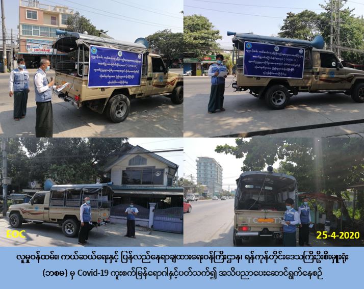 လူမှုဝန်ထမ်း၊ ကယ်ဆယ်ရေးနှင့် ပြန်လည်နေရာချထားရေးဝန်ကြီးဌာန၊ ဘေးအန္တရာယ်ဆိုင်ရာစီမံခန့်ခွဲမှုဦးစီးဌာန၊ ရန်ကုန်တိုင်းဒေသကြီးဦးစီးမှူးရုံးမှ တာဝန်ရှိသူများသည် (၂၅-၄-၂၀၂၀) ရက်နေ့တွင် ရန်ကုန်အရှေ့ပိုင်းခရိုင်၊ ဒဂုံမြို့သစ် (မြောက်ပိုင်း) မြို့နယ်၊ အမှတ်(၃၃/၃၄/၃၂/၃၅/၃၆/၃၇/၃၈/၃၉) ရပ်ကွက်များတွင် Covid-19 အသက်ရှူလမ်းကြောင်းဆိုင်ရာရောဂါနှင့်ပတ်သက်၍ ကျန်းမာရေးနှင့်အားကစားဝန်ကြီးဌာန မှ ထုတ်ပြန်ထားသောအသိပေးကြေငြာချက်များအား ရပ်ကွက်များအတွင်း သက်ဆိုင်ရာ ကျန်းမာရေးဦးစီးဌာန၊ အထွေထွေအုပ်ချုပ်ရေးဦးစီးဌာနမှ တာဝန်ရှိသူများနှင့်အတူပူးပေါင်း၍ အသိပညာပေးကြော်ငြာခြင်းများ ပြုလုပ်ခဲ့ပါကြောင်း သိရှိရပါသည်။