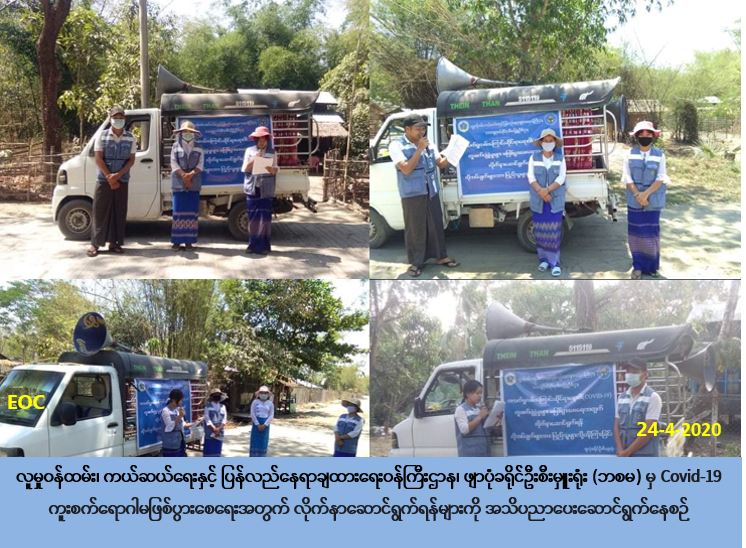 လူမှုဝန်ထမ်း၊ ကယ်ဆယ်ရေးနှင့် ပြန်လည်နေရာချထားရေးဝန်ကြီးဌာန၊ ဘေးအန္တရာယ်ဆိုင်ရာစီမံခန့်ခွဲမှုဦးစီးဌာန၊ ဖျာပုံခရိုင်ဦးစီးမှူးရုံးမှတာဝန်ရှိသူများသည် (၂၄ -၄-၂၀၂၀) ရက်နေ့တွင် ဒေးဒရဲမြို့နယ်၊ ကျုံကျပ်ကျွန်းကျေးရွာ၊ ကျီးစုကျေးရွာ၊ ဘေးကြီးကျေးရွာ၊ ဖိုကျော်ခေါင်ကျေးရွာ၊ ကျုံဒရယ်ကျေးရွာ၊ သာယာကုန်းကျေးရွာ၊ ကျုံဒူးကျေးရွာ၊ ဓါးမလိမ်ကျေးရွာ၊ တော်ကမံဂွကျေးရွာ၊ ဓါးမလိမ်ချောင်းဝကျေးရွာ၊အောက်ကွင်းကျေးရွာ၊ညောင်ကားယားကျေးရွာ၊ ကျုံကျပ်ကျေးရွာ၊ ကင်းမွန်းကုန်းကျေးရွာ၊ ကျုံဟွတ်ကျေးရွာ၊ ဘုရားကြီးကုန်းကျေးရွာ၊ တော်ကြပ်ကျေးရွာ၊ သမှံပင်ဆိပ်ကျေးရွာများ၌ ခရိုင်လူမှုဝန်ထမ်း ဦးစီးဌာနမှတာဝန်ရှိသူတို့နှင့်အတူ COVID-19 ရောဂါကူးစက်ပျံ့နှံ့မှုများ မဖြစ်ပွားစေရေးအတွက် လိုက်နာဆောင်ရွက်ရန်များကို ကျေးရွာရှိပြည်သူများအား အသိပညာပေးခြင်းလုပ်ငန်းများ ဆောင်ရွက်ခဲ့ပါကြောင်း သိရှိရပါသည်။