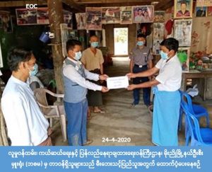 လူမှုဝန်ထမ်း၊ ကယ်ဆယ်ရေးနှင့် ပြန်လည်နေရာချထားရေးဝန်ကြီးဌာန၊ ဘေးအန္တရာယ်ဆိုင်ရာ စီမံ ခန့်ခွဲမှုဦးစီးဌာန၊ မိုးညိုမြို့နယ်ဦးစီးမှူးရုံးမှ တာဝန်ရှိသူများသည် (၁၂-၄-၂၀၂၀)ရက်နေ့၊ (၁၇:၀၀) နာရီ အချိန်၌ ပဲခူးတိုင်းဒေသကြီး၊ သာယာဝတီခရိုင်၊ မိုးညိုမြို့နယ်၊ လက်ပံခုန်ကျေးရွာအုပ်စု၊ ဘူးခုံကျေးရွာ တွင် ဖြစ်ပွားခဲ့သော မီးဘေးမှ မီးဘေးသင့်ဒဏ်ရာရလူနာ(၁)ဦးအတွက် ဒဏ်ရာရထောက်ပံငွေ (၅၀,၀၀၀) ကျပ်အား (၂၀-၄-၂၀၂၀)ရက်နေ့၌ထောက်ပံ့ခဲ့ပြီးဖြစ်ရာ အဆိုပါလူနာသည် (၂၂-၄-၂၀၂၀) ရက် နေ့၌ သေဆုံးသွားပါသဖြင့် ထပ်တိုးထောက်ပံ့ငွေ (၂၅၀,၀၀၀)ကျပ်အား (၂၄-၄-၂၀၂၀)ရက်နေ့ (၁၀:၀ဝ) နာရီအချိန်တွင် မီးဘေးသင့်နေအိမ်၌ တိုင်းဒေသကြီးလွှတ်တော်ကိုယ်စားလှယ်-၂၊ ရဲတပ်ဖွဲ့၊ ကျေးရွာ အုပ်ချုပ်ရေးမှူးနှင့်အတူ ပြည်သူလက်ဝယ်အရောက် ထောက်ပံ့ပေးအပ်ခဲ့ကြောင်း သိရှိရပါသည်။
