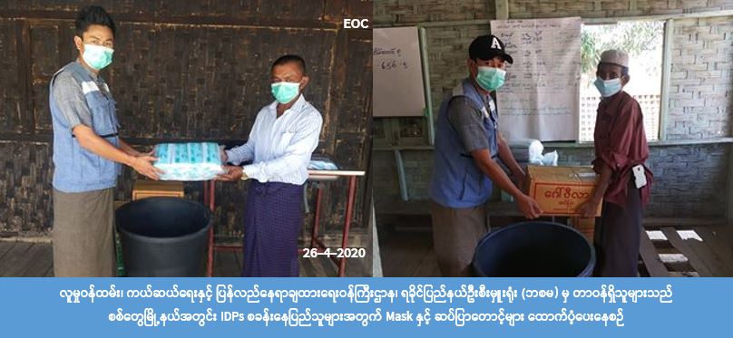 လူမှုဝန်ထမ်း၊ ကယ်ဆယ်ရေးနှင့် ပြန်လည်နေရာချထားရေးဝန်ကြီးဌာန၊ ဘေးအန္တရာယ်ဆိုင်ရာ စီမံ ခန့်ခွဲမှုဦးစီးဌာန၊ ရခိုင်ပြည်နယ်ဦးစီးမှူးရုံးမှ တာဝန်ရှိသူများသည် (၂၆-၄-၂၀၂၀)ရက်တွင် စစ်တွေမြို့နယ်၊ ဒါးပိုင် IDPစခန်းမှ အိမ်ထောင်စု(၁)စုလျှင် Mask(၂)ခုနှင့် ဆပ်ပြာ(၁)တောင့်နှုန်းဖြင့် အိမ်ထောင်စု (၄၄၈) စုအတွက် Mask (၈၉၆) ခု၊ ဆပ်ပြာ (၄၄၈) တောင့်နှင့် (လက်ဆေးဘေစင်၊ ရေပုံး၊ ရေချိုးခွက်၊ ဆပ်ပြာမွှေး၊ ဆပ်ပြာခွက်)(၅)စုံ တို့ကိုလည်းကောင်း၊ မော်သီးညာ IDP စခန်းမှ အိမ်ထောင်စု (၆၅၆) စုအတွက် Mask (၁,၃၁၂)ခု၊ ဆပ်ပြာ (၆၅၆) တောင့်နှင့် (လက်ဆေးဘေစင် ၊ ရေပုံး၊ ရေချိုးခွက်၊ ဆပ်ပြာ မွှေး၊ ဆပ်ပြာခွက်) (၅)စုံ တို့ကိုလည်းကောင်း IDPs စခန်းနေပြည်သူများအတွက် သွားရောက်ထောက်ပံ့ ပေးခဲ့ကြောင်း သိရှိရပါသည်။