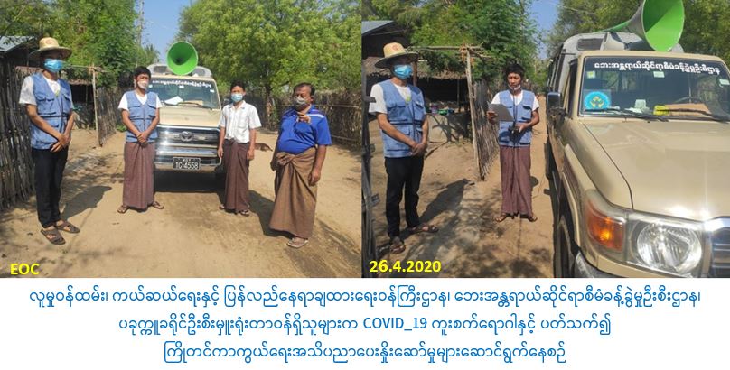 လူမှုဝန်ထမ်း၊ ကယ်ဆယ်ရေးနှင့် ပြန်လည်နေရာချထားရေးဝန်ကြီးဌာန၊ ဘေးအန္တရာယ်ဆိုင်ရာစီမံခန့်ခွဲမှုဦးစီးဌာန၊ ပခုက္ကူခရိုင်ဦးစီးမှူးရုံးမှ တာဝန်ရှိသူများသည် (၂၆-၄-၂၀၂၀) ရက်နေ့ (၀၉:ဝ၀) အချိန်မှ (၁၉:ဝဝ) အချိန်ထိ ကန်တော်ကျေးရွာအုပ်စု၊ ကံလှကျေးရွာ၊ ငဖောင် ကန်ကျေးရွာနှင့် ရေမျက်အုပ်စု၊ ရေမျက်ကျေးရွာများသို့ COVID-19 ကူးစက်မြန်ရောဂါ ကြိုတင်ကာကွယ်ရေးပြည်သူများသို့ အသိပညာပေးပန်ကြားချက်များနှင့် မကွေးတိုင်းဒေသကြီး အစိုးရအဖွဲ့၏ ပြည်သူများသို့ပန်ကြားချက်များအား လှည့်လည်အသိပေးခြင်းတို့ကို ဆောင်ရွက် ခဲ့ပါကြောင်း သတင်းရရှိပါသည်။