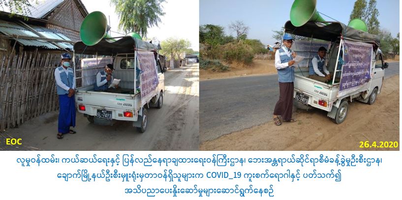 လူမှုဝန်ထမ်း၊ ကယ်ဆယ်ရေးနှင့် ပြန်လည်နေရာချထားရေးဝန်ကြီးဌာန၊ ဘေးအန္တရာယ်ဆိုင်ရာစီမံခန့်ခွဲမှုဦးစီးဌာန၊ မကွေးတိုင်းဒေသကြီး၊ ချောက်မြို့နယ်ဦးစီးမှူးရုံးမှ တာဝန်ရှိသူများသည် (၂၆-၄-၂၀၂၀) ရက်နေ့ (၀၈:၃၀) နာရီမှ (၁၁:၀၀) နာရီအချိန်ထိ မကွေးခရိုင်၊ ချောက်မြို့နယ်အတွင်းရှိ ချောင်းတက်ကျေးရွာနှင့် မကျည်းဇောက်ကျေးရွာများသို့ COVID-19 ရောဂါနှင့် ပတ်သက်၍ ကာကွယ်၊ တားဆီး၊ ထိန်းချုပ်၊ ကုသရေးဆိုင်ရာ ပြည်သူလူထုအသိပညာပေး ပန်ကြားချက်များကို လှည့်လည်ဟောပြော ဆောင်ရွက်ခဲ့ပါကြောင်း သတင်းရရှိပါသည်။
