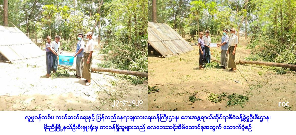 လူမှုဝန်ထမ်း၊ ကယ်ဆယ်ရေးနှင့် ပြန်လည်နေရာချထားရေးဝန်ကြီးဌာန၊ ဘေးအန္တရာယ်ဆိုင်ရာစီမံခန့်ခွဲမှုဦးစီးဌာန၊ မိုးညိုမြို့နယ်ဦးစီးမှူးရုံးမှ တာဝန်ရှိသူများသည် ပဲခူးတိုင်းဒေသကြီး၊ သာယာဝတီခရိုင်၊ မိုးညိုမြို့နယ်၊ ထိန်တောကျေးရွာအုပ်စု၊ ကျွန်းကြီးကျေးရွာ၌ (၂၆-၄-၂၀၂၀)ရက်နေ့၊ (၁၉း၀၀)နာရီအချိန်တွင် ဖြစ်ပွားခဲ့သော လေဘေးကြောင့် သစ်ပင်ပိ၍ ပျက်စီးခဲ့သည့်နေအိမ်(၁)လုံးအတွက် အိမ်ဆောက်ပစ္စည်းဖိုးထောက်ပံ့ငွေ (၁၀၀၀၀၀) ကျပ်၊ အိမ်ထောင်စု(၁)စုမှ လူဦးရေ(၅)ဦးတို့အတွက် ဆန်ရိက္ခာဖိုးထောက်ပံငွေ (၁၀၅၀၀) ကျပ်၊ စုစုပေါင်းထောက်ပံ့ငွေ (၁၁၀၅၀၀) ကျပ်တိတိနှင့် ကယ်ဆယ်ရေးပစ္စည်း(၁၆)မျိုး(ပလပ်စတစ်ပုံးအပါ)(၁)အိမ်ထောင်စာအား (၂၇-၄-၂၀၂၀) ရက်နေ့၊ (၁၂း၃ဝ) နာရီအချိန်တွင် မြို့နယ်မီးသတ်တပ်ဖွဲ့ဝင်များ၊ ကျေးရွာအုပ်ချုပ်ရေးမှူးနှင့်အတူ ဘေးသင့်ပြည်သူလက်ဝယ်အရောက် သွားရောက်ထောက်ပံ့ပေးအပ်ခဲ့ကြောင်း သတင်းရရှိပါသည်။