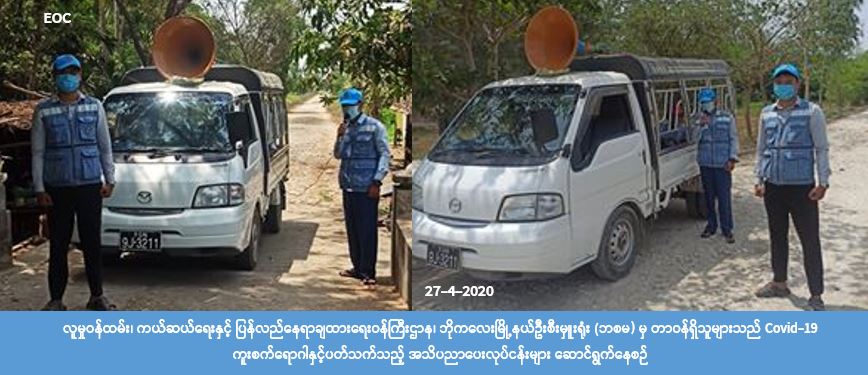 လူမှုဝန်ထမ်း၊ ကယ်ဆယ်ရေးနှင့် ပြန်လည်နေရာချထားရေးဝန်ကြီးဌာန၊ ဘေးအန္တရာယ်ဆိုင်ရာ စီမံ ခန့်ခွဲမှု ဦးစီးဌာန၊ ဘိုကလေးမြိုနယ်ဦးစီးမှူးရုံးမှ တာဝန်ရှိသူများသည် (၂၇-၄-၂၀၂၀) ရက်နေ့တွင် (၁၁:၀၀)နာရီ၌ ဘိုကလေးမြို့နယ်၊ သကံဝကျေးရွာအုပ်စု၊ သကံဝကျေးရွာတွင် လည်းကောင်း၊ (၁၂:၀၀)နာရီ၌ တယ်ပင်တစ်ကျေးရွာတွင် လည်းကောင်း၊ (၁၃:၃၀) နာရီ၌ တယ်ပင်နှစ်ကျေးရွာတွင် လည်းကောင်း၊ (၁၄:၀၀)နာရီ၌ တယ်ပင်သုံးကျေးရွာတွင် လည်းကောင်း၊ (၁၅:၃၀) နာရီ၌ ဓနုံးချောင်း ကျေးရွာတွင် လည်းကောင်း Covid- 19 ကူးစက်ရောဂါနှင့်ပတ်သက်ပြီး ဆောင်ရန်၊ ရှောင်ရန်များ နှိုးဆော် ခြင်းကို ကျေးရွာရှိအုပ်ချုပ်ရေးမှူး၊ ရပ်မိရပ်ဖများနှင့်အတူ ကျေးရွာနေပြည်သူတို့အား အသိပညာပေးခြင်းများ ဆောင်ရွက်ခဲ့ကြောင်း သိရှိရပါသည်။