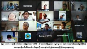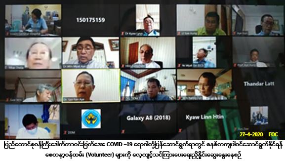 COVID – 19 ရောဂါတုံ့ပြန်ဆောင်ရွက်ရာတွင် စနစ်တကျပါဝင်ဆောင်ရွက်နိုင်ရန် စေတနာ့ဝန်ထမ်း (Volunteer) များကို လေ့ကျင့်သင်ကြားပေးရေးနှင့်ပတ်သက်၍ စေတနာ့ဝန်ထမ်း သင်တန်း လက်စွဲစာအုပ်ပြုစုရန် မြန်မာနိုင်ငံဆရာဝန်အသင်း အသင်းဥက္ကဌ၊ ဒုတိယဥက္ကဌများ၊ ဘာသာရပ်ဆိုင်ရာဆရာ၊ ဆရာမကြီးများနှင့် (၂၅.၄.၂၀၂၀) ရက်နေ့ ညနေပိုင်းက လူမှုဝန်ထမ်း၊ ကယ်ဆယ်ရေးနှင့် ပြန်လည်နေရာချထား ရေးဝန်ကြီးဌာန ပြည်ထောင်စုဝန်ကြီး ဒေါက်တာဝင်းမြတ်အေးက Video Conference ဖြင့် ညှိနှိုင်းဆွေးနွေး ခဲ့ပါသည်။