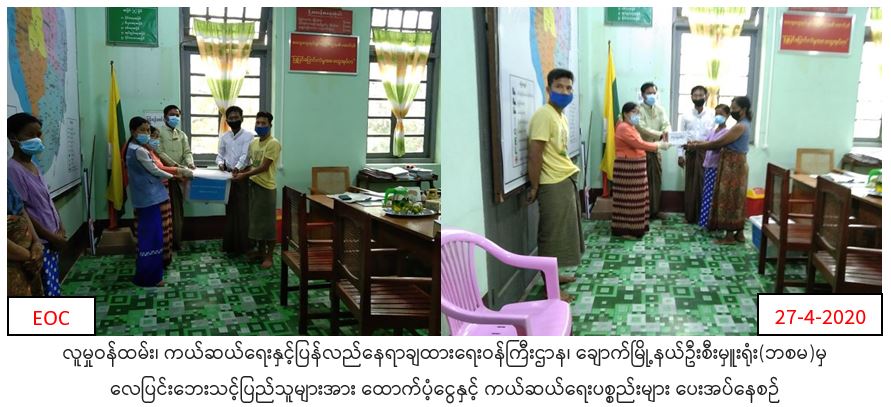 လူမှုဝန်ထမ်း၊ ကယ်ဆယ်ရေးနှင့်ပြန်လည်နေရာချထားရေးဝန်ကြီးဌာန၊ ဘေးအန္တရာယ်ဆိုင်ရာစီမံခန့်ခွဲမှုဦးစီးဌာန၊ ချောက်မြို့နယ်ဦးစီးမှူးရုံးမှ တာဝန်ရှိသူများသည်(၂၆.၄.၂၀၂၀)ရက်နေ့(၁၅း၃၀)နာရီအချိန်တွင် ချောက်မြို့ အမှတ်(၇) ရပ်ကွက်၌ လေးပြင်းတိုက်ခတ်မှု ဖြစ်ပွါးခဲ့သောကြောင့် လုံးပျက်စီးအိမ်ခြေ(၁)လုံး၊ အမိုးလန်အိမ်ခြေ (၂)လုံး၊ အိမ်ထောင်စု(၃)စု၊ လူဦးရေ (၁၅)ဦးတို့ လေဘေးသင့်ခဲ့ပြီး လုံးဝပျက်စီးနေအိမ်(၁)လုံးအတွက် အိမ်ဆောက်ပစ္စည်းဖိုးထောက်ပံ့ငွေကျပ်(၁၀၀,၀၀ဝိ/-)၊ အမိုးလန်နေအိမ်(၂)လုံးအတွက် အိမ်ဆောက်ပစ္စည်းဖိုးထောက်ပံ့ငွေကျပ်(၄၀၀၀၀ိ/- )နှင့် လူဦးရေ(၁၅)ဦးတို့အတွက် ဆန်ရိက္ခာဖိုး ထောက်ပံ့ငွေကျပ်(၃၁၅၀၀ိ/-)၊ စုစုပေါင်းငွေကျပ် (၁၇၁၅၀၀ိ/-)နှင့် လုံးဝပျက်စီးနေအိမ်(၁)လုံးအတွက် ကယ်ဆယ်ရေးပစ္စည်း(၁၆)မျိုး (၁)အိမ်ထောင်စုစာ တို့အား(၂၇-၄-၂၀၂၀)ရက်နေ့(၁၆း၃၀)နာရီအချိန်တွင် အထွေထွေအုပ်ချုပ်ရေးဦးစီးဌာနရုံးခန်း၌ ဒုတိယမြို့နယ်အုပ်ချုပ်ရေးမှူး၊ လွှတ်တော်ကိုယ်စားလှယ်များနှင့် အတူလေဘေးသင့်ပြည်သူများထံသို့သွားရောက်၍ ထောက်ပံ့ပေးခဲ့ကြောင်း သတင်းရရှိပါသည်။