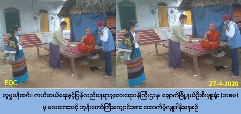 လူမှုဝန်ထမ်း၊ ကယ်ဆယ်ရေးနှင့် ပြန်လည်နေရာချထားရေးဝန်ကြီးဌာန၊ ဘေးအန္တရာယ် ဆိုင်ရာစီမံခန့်ခွဲမှုဦးစီးဌာန၊ ချောက်မြို့နယ်ဦးစီးမှူးရုံးမှ တာဝန်ရှိသူများသည် ချောက်မြို့ နယ်၊ တောင်ဘလူကျေးရွာအုပ်စု၊ မဲရွာကျေးရွာ၌ (၂၅-၄-၂၀၂၀) ရက်နေ့၊ (၁၃:၃၀) နာရီ အချိန်တွင် ဖြစ်ပွားခဲ့သောလေပြင်းဘေးကြောင့် ရွာဦးဘုန်းတော်ကြီးကျောင်းရှိ ဆွမ်းစား ဆောင်(၂) ဆောင်အမိုးလန်ပျက်စီးခဲ့သဖြင့် ကျောင်းဆောက်ထောက်ပံ့ငွေ (၁၂၀,၀၀ဝ/-) ကျပ်အား (၂၇-၄-၂၀၂၀) ရက်နေ့တွင် ချောက်မြို့နယ်အထွေထွေအုပ်ချုပ်ရေးဦးစီးဌာမှ တာဝန်ရှိသူများနှင့်အတူ ဘေးသင့်ပြည်သူများ၏ လက်ဝယ်အရောက်သွားရောက် ထောက်ပံ့ ပေးခဲ့ပါကြောင်း သတင်းရရှိပါသည်။