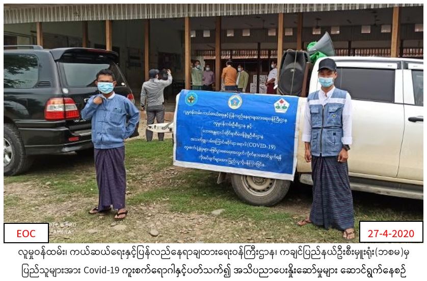 လူမှုဝန်ထမ်း၊ ကယ်ဆယ်ရေးနှင့်ပြန်လည်နေရာချထားရေးဝန်ကြီးဌာန၊ ဘေးအန္တရာယ်ဆိုင်ရာစီမံခန့်ခွဲမှုဦးစီးဌာန၊ ကချင်ပြည်နယ်ဦးစီးမှူးရုံးမှ တာဝန်ရှိသူများသည် (၂၇-၄-၂၀၂၀) ရက်နေ့တွင် ကချင်ပြည်နယ်အစိုးရအဖွဲ့မှ IDPs စခန်းများသို့ ဆန်ရိက္ခာ ထောက်ပံ့သော လူမှုရေးဝန်ကြီး၏ လမ်းကြောင်း၌ လိုက်ပါ၍ Covid-19 နှင့်ပတ်သက်၍ မြစ်ကြီးနားမြို့နယ်ရှိ၊ နန်းကွေ့စိန်ယောဟန်၊ မော်ဖောင်းလဝေါ်နှစ်ခြင်း၊ မော်ဖောင်းခါနန်နှစ်ခြင်း၊ မန်ခိန်နှစ်ခြင်း၊ ရွှေစက်နှစ်ခြင်း IDPs စခန်းများ၌ အသက်ရှူလမ်းကြောင်းဆိုင်ရာ ကူးစပ်ရောဂါ Covid-19 ကာကွယ်၊ တားဆီး၊ ထိန်းချုပ်ကုသရေးဆိုင်ရာ ပြည်သူ့ပန်ကြားချက်အသိပညာပေးမှုအား အသံချဲ့စက်ဖြင့် လှည့်လည်ဟောပြောခြင်းအား ဆောင်ရွက်ခဲ့ကြောင်း သတင်းရရှိပါသည်။