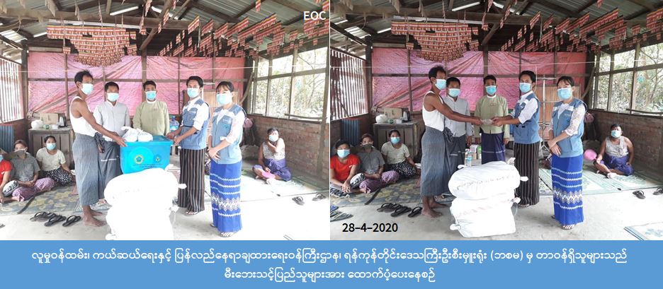 ရန်ကုန်တိုင်းဒေသကြီးတောင်ပိုင်းခရိုင်၊ ခရမ်းမြို့နယ်၊ အမှတ်(၆)ရပ်ကွက်တွင်(၂၄-၄-၂၀၂၀) ရက်နေ့ (၁၅: ၄၅) နာရီအချိန်၌ ဒေါ်ခင်ရွှေပိုင်ဆိုင်သည့် ဆေးပေါ့လိပ်ဆေးစပ်ဂိုဒေါင်သွပ်မိုးထရံကာမှ မီးစတင် လောင်ကျွမ်းခဲ့ရာ ဆေးစပ်ဂိုဒေါင် (၃) လုံးနှင့် ဘေးရှိလူနေအိမ် (၁) လုံးသို့ မီးကူးစက်လောင်ကျွမ်းခဲ့ရာ၊ အိမ်ခြေ(၁)လုံးမီးလောင်ဆုံးရှုံးခဲ့ပြီး၊ အိမ်ထောင်စု(၁)စုမှ လူဦးရေ(၅) ဦးတို့ မီးဘေးသင့်ခဲ့ပါသဖြင့် လူမှုဝန်ထမ်း၊ ကယ်ဆယ်ရေးနှင့် ပြန်လည်နေရာချထားရေးဝန်ကြီးဌာန၊ ဘေးအန္တရာယ်ဆိုင်ရာ စီမံခန့်ခွဲ မှုဦးစီးဌာန၊ ရန်ကုန်တိုင်းဒေသကြီးဦးစီးမှူးရုံးမှ တာဝန်ရှိသူများသည် အိမ်ဆောက်ပစ္စည်းဖိုးထောက်ပံ့ငွေ(၂၀၀,၀၀ဝ/-)ကျပ်၊ ဆန်ရိက္ခာဖိုးထောက်ပံ့ငွေ (၁၀,၅၀ဝ/-) ကျပ်နှင့် အိမ်ထောင်စု (၁) စုစာ ကယ်ဆယ်ရေးပစ္စည်း(၁၆)မျိုး တို့အား အထွေထွေအုပ်ချုပ်ရေးဦးစီးဌာနမှ တာဝန်ရှိသူများနှင့်အတူ ဘေးသင့်ပြည်သူများထံသို့ (၂၈-၄-၂၀၂၀)ရက်နေ့တွင် သွားရောက်၍ ထောက်ပံ့ပေးခဲ့ကြောင်း သိရှိရ ပါသည်။