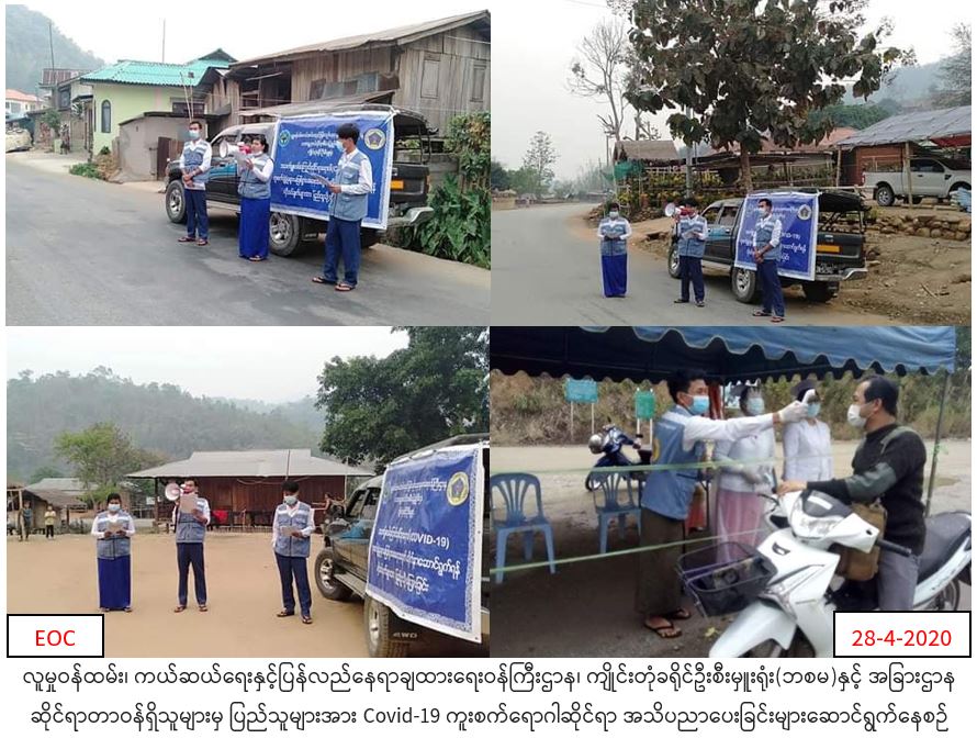 လူမှုဝန်ထမ်း၊ ကယ်ဆယ်ရေးနှင့်ပြန်လည်နေရာချထားရေးဝန်ကြီးဌာန၊ ဘေးအန္တရာယ်ဆိုင်ရာစီမံခန့်ခွဲမှုဦးစီးဌာန၊ ကျိုင်းတုံခရိုင်ဦးစီးမှူးရုံး မှ တာ၀န်ရှိသူများသည် (၂၈ – ၄ -၂၀၂၀)ရက်နေ့တွင် မြို့နယ်အထွေထွေအုပ်ချုပ်ရေးဦးစီးဌာန၊ မြို့နယ်ပြည်သူ့ကျန်းမာရေးဦးစီးဌာန၊ မြို့နယ်ကြက်ခြေနီအသင်းတို့နှင့်ပူပေါင်း၍ ကျိုင်းတုံ -တာချီလိတ်၊ နောင်နွန်းစုပေါင်းဂိတ်၌ ကျိုင်းတုံမြို့တွင်းသို့ အ၀င် /အထွက် ယာဥ်လိုင်းများတွင်စီးနှင်းလိုက်ပါသော ခရီးသည်များအား ကျန်းမာရေးစစ်ဆေးခြင်း၊ မှတ်တမ်းကောက်ယူခြင်းနှင့် ကျိုင်းတုံမြို့၊ နောင်ဆာကျေးရွာအုပ်စု၊ နောင်ဆာကျေးရွာ၊ နောင်ဆာ(ကချင်)နှင့် နောင်ဆာ(လာဟူး)ကျေးရွာတို့တွင် နိုင်ငံအသီးသီးတွင် ကူးစက်ပြန့်ပွား လျက်ရှိသော COVID – 19 ကူးစက် ရောဂါကြိုတင်ကာကွယ်ထိန်းချုပ်နိုင်ရေးအတွက် COVID-19 ရောဂါ ကူးစက်ပြန့်နှံ့မှုမဖြစ်ပွားစေရန် သိရှိ လိုက်နာဆောင်ရွက်ရမည်အချက်များကို အသိပညာပေးဟောပြောခဲ့ကြောင်း သတင်းရရှိပါသည်။