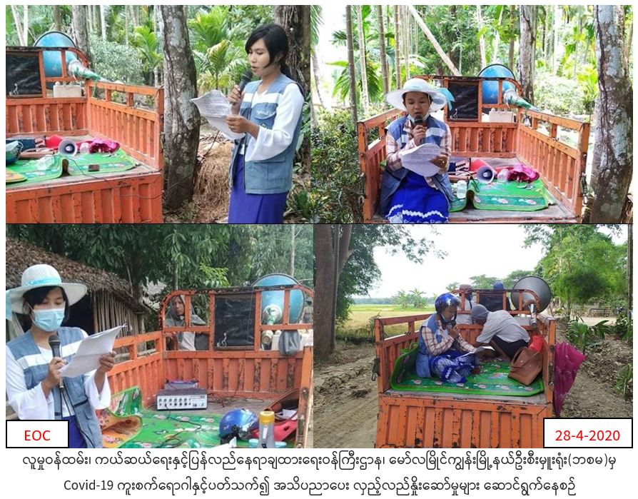 လူမှုဝန်ထမ်း၊ ကယ်ဆယ်ရေးနှင့်ပြန်လည်နေရာချထားရေးဝန်ကြီးဌာန၊ ဘေးအန္တရာယ်ဆိုင်ရာစီမံခန့်ခွဲမှုဦးစီးဌာန၊ မော်လမြိုင်ကျွန်းမြို့နယ်ဦးစီးမှူးရုံးမှ တာဝန်ရှိသူများသည် အထွေထွေအုပ်ချုပ်ရေးဦးစီးဌာနနှင့် အတူပူးပေါင်း၍ (၂၈-၄-၂၀၂၀) ရက်နေ့၊ (၀၉း၀၀)နာရီအချိန်မှ (၁၂း၀၀)နာရီအချိန်ထိ မော်လမြိုင်ကျွန်းမြို့နယ်၊ ဖူထီကျေးရွာအုပ်စုအတွင်းရှိ ဖူထီရွာမကျေးရွာ၊ နွားရေကျော်ကျေးရွာ၊ ချောင်းဝကျေးရွာနှင့် စာဖြူ စုကျေးရွာတို့၌ ဌာနမှပေးပို့ထားသော Covid-19နှင့်ပတ်သက်သည့် ဆောင်ရန်/ ရှောင်ရန်အသံဖိုင်ဖြင့်လည်းကောင်း၊ Hand Speaker ၊ Loud Speaker များဖြင့်လည်းကောင်း လှည့်လှည်၍ အသိပညာပေးနှိုးဆော်မှုများဆောင်ရွက်ခဲ့ကြောင်း သတင်းရရှိပါသည်။