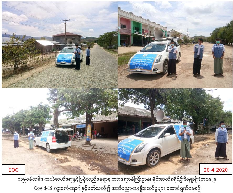 လူမှုဝန်ထမ်း၊ ကယ်ဆယ်ရေးနှင့်ပြန်လည်နေရာချထားရေးဝန်ကြီးဌာန၊ ဘေးအန္တရာယ်ဆိုင်ရာစီမံခန့်ခွဲမှုဦးစီးဌာန၊ မိုင်းဆတ်ခရိုင်ဦးစီးမှူးရုံးမှ တာဝန်ရှိသူများသည် (၂၈-၄-၂၀၂၀)ရက်နေ့တွင် မိုင်းဆတ်မြို့နယ်၊ မယ်ကျန်းကျေးရွာ၊ ကောင်းမှူးတန်ကျေးရွာ၊ တန့်ဆိုင်ကျေးရွာ၊ ပန်ဟိုက်ကျေးရွာ၊ ဝမ်မိုင်ကျေးရွာများသို့ လှည့်လည်ပြီး အသက်ရှုလမ်းကြောင်းဆိုင်ရာကူးစက်ရောဂါ COVID-19နှင့် ပတ်သက်၍ ကြိုတင်ကာကွယ်နိုင်ရေး ပြည်သူသို့ ပန်ကြားချက်အသိပညာပေးမှုအား အသံချဲ့စက်ဖြင့် လှည့်လည်ဟောပြောခြင်းဆောင်ရွက်ခဲ့ကြောင်း သတင်းရရှိပါသည်။