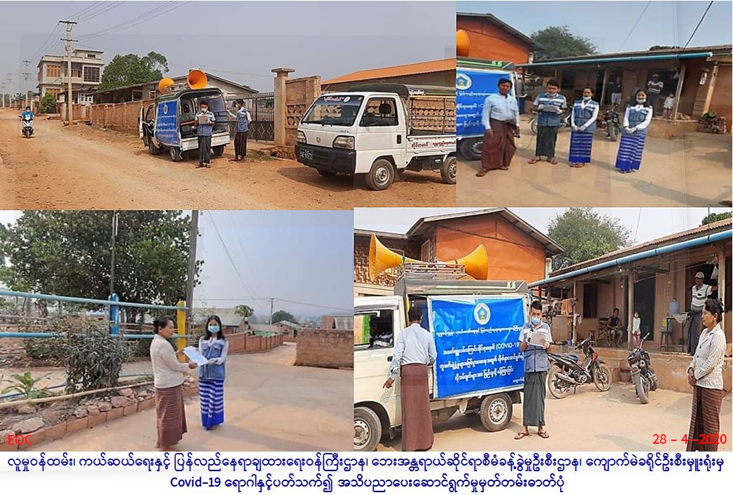 လူမှုဝန်ထမ်း၊ ကယ်ဆယ်ရေးနှင့်ပြန်လည်နေရာချထားရေးဝန်ကြီးဌာန၊ ဘေးအန္တရာယ်ဆိုင်ရာစီမံခန့်ခွဲမှုဦးစီးဌာန၊ ကျောက်မဲ ခရိုင်ဦးစီးမှူးရုံးမှ တာဝန်ရှိသူများသည် (၂၈-၄-၂၀၂၀) ရက်နေ့တွင် ကျောက်မဲမြို့နယ် အတွင်းရှိ မိုင်းငေါ့မြို့၊ မန်ပင့်ကျေးရွာများ တွင် COVID-19 ရောဂါကူးစက်ပျံ့နှံမှုများမဖြစ်ပွားစေရန်အတွက် ဆောင်ရန်၊ ရှောင်ရန်များကို ဗမာဘာသာ၊ ရှမ်းဘာသာ၊ ပလောင်ဘာသာ စကားများဖြင့် အသိပေးဟောပြောဆောင်ရွက် ခဲ့ပါကြောင်း သတင်းရရှိပါသည်။
