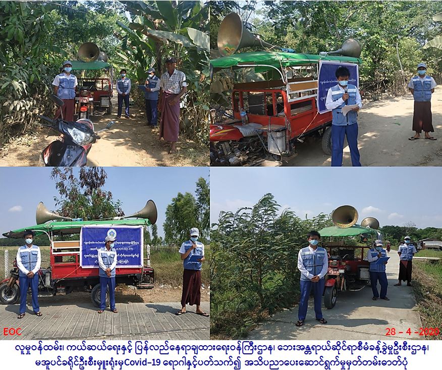လူမှုဝန်ထမ်း၊ ကယ်ဆယ်ရေးနှင့်ပြန်လည်နေရာချထားရေးဝန်ကြီးဌာန၊ ဘေးအန္တရာယ်ဆိုင်ရာစီမံခန့်ခွဲမှုဦးစီးဌာန၊ မအူပင်ခရိုင် ဦးစီးမှူးရုံးမှ တာဝန်ရှိသူများသည် (၂၈-၄-၂၀၂၀) ရက်နေ့တွင် မအူပင်မြို့နယ်၊ ကွန်စုကျေးရွာအုပ်စုအတွင်းရှိ ကျေးရွာခွဲ(၆)ရွာ၌ Covid-19 ရောဂါ ကူးစက်ပျံ့ပွားမှုများ မဖြစ်ပွားစေရန်တွက် အများပြည်သူသိရှိလိုက်နာဆောင်ရွက်ရန်အချက်များအား လော်စပီကာ၊ ဟန်းစပီကာများဖြင့် လှည့်လည်ဟောပြောခြင်း ဆောင်ရွက်ခဲ့ပါကြောင်း သတင်းရရှိပါသည်။