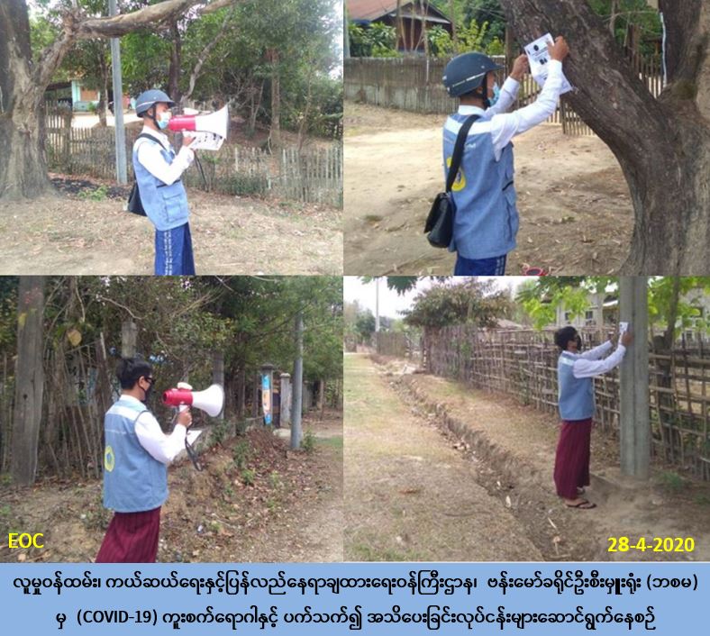 လူမှုဝန်ထမ်း၊ ကယ်ဆယ်ရေးနှင့် ပြန်လည်နေရာချထားရေးဝန်ကြီးဌာန၊ ဘေးအန္တရာယ် ဆိုင်ရာစီမံခန့်ခွဲမှုဦးစီးဌာန၊ ဗန်းမော်ခရိုင်ဦးစီးမှူးရုံးမှ တာဝန်ရှိသူများသည် (၂၈-၄-၂၀၂၀) ရက်နေ့တွင် မံစီမြို့နယ်အတွင်းရှိ နမ့်မဖွဲကျေးရွာနှင့် ကောင်ရာရပ်ကွက်တို့တွင် ပြည်သူ များအား covid-19 ရောဂါနှင့်ပတ်သက်၍ ဆောင်ရန်/ရှောင်ရန်အချက်များကို အသိပညာ ပေးနှိုးဆော်ခြင်းနှင့် အသိပညာပေးစာစောင်များကပ်ခြင်းလုပ်ငန်းများအား ဆောင်ရွက်ခဲ့ပါ ကြောင်းသတင်းရရှိပါသည်။