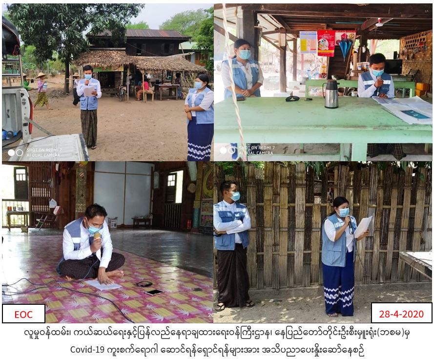 လူမှုဝန်ထမ်း၊ ကယ်ဆယ်ရေးနှင့်ပြန်လည်နေရာချထားရေးဝန်ကြီးဌာန၊ ဘေးအန္တရာယ်ဆိုင်ရာစီမံခန့်ခွဲမှုဦးစီးဌာန၊ ပြည်ထောင်စုနယ်မြေ၊ နေပြည်တော်တိုင်းဦးစီးမှူးရုံးမှ တာဝန်ရှိသူများသည် (၂၈-၄-၂၀၂၀) ရက်နေ့ နံနက် (၁၀:၀၀) အချိန်မှ ညနေ(၁၆:၀၀) အချိန်အထိ လယ်ဝေးမြို့နယ်၊ ပြောင်ခေါင်းကြီးကျေးရွာအုပ်စု၊ ပြောင်ခေါင်းကြီးကျေးရွာ၊ ပန်းတင်ကျေးရွာ၊သာယာကြီးကျေးရွာ၊ ကန်ဇွန်းခင်းကျေးရွာ၊ ကြို့ဇလုပ်ကျေးရွာများအတွင်းရှိ ပြည်သူများအား COVID-19 ရောဂါကူးစက်ပြန့်နှံ့မှုများ မဖြစ်ပွားစေရန်အတွက် သိရှိလိုက်နာဆောင်ရွက်ရမည့်အချက်များနှင့် ပတ်သက်၍အသိပညာပေးခြင်းများ ဆောင်ရွက်ခဲ့ကြောင်း သတင်းရရှိပါသည်။