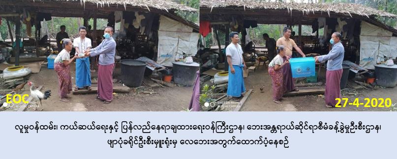 လူမှုဝန်ထမ်း၊ ကယ်ဆယ်ရေးနှင့် ပြန်လည်နေရာချထားရေးဝန်ကြီးဌာန၊ ဘေးအန္တရာယ်ဆိုင်ရာ စီမံခန့်ခွဲမှုဉီးစီးဌာန၊ ဖျာပုံခရိုင်ဦးစီးမှူးရုံးမှ တာဝန်ရှိသူများသည် ဖျာပုံမြို့နယ်၊ သဲအိမ်ကျောင်းစုကျေးရွာအုပ်စု၊ သဲအိမ်ကျောင်းစုကျေးရွာတို့၌ (၂၆-၄-၂၀၂၀) ရက်နေ့တွင် ဖြစ်ပွားခဲ့သော လေပြင်းတိုက်ခတ်မှုကြောင့် လေဘေးသင့်ခဲ့သော နေအိမ် (၁) လုံး၊ အိမ်ထောင်စု (၁) စုအတွက် (၃၄၇၅၃/-) ကျပ် တန်ဖိုးရှိ ကယ်ဆယ်ရေး ပစ္စည်း(၁၆)မျိုး စက္ကူပုံးပါ(၁)အိမ်ထောင်စာ၊ ဘေးသင့်ပြည်သူ (၃) ဦး အတွက် ဆန်ရိက္ခာဖိုးထောက်ပံ့ငွေ (၆၃၀၀/-) ကျပ်နှင့် အိမ်ဆောက် ပစ္စည်းဖိုးထောက်ပံ့ငွေ (၁၀၀၀၀၀/-) ကျပ် တို့ကို (၂၇-၄-၂၀၂၀) ရက်နေ့တွင် ကွင်းဆင်း ထောက်ပံ့ခဲ့ကြောင်း သတင်းရရှိပါသည်။