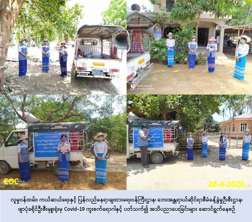 လူမှုဝန်ထမ်း၊ ကယ်ဆယ်ရေးနှင့် ပြန်လည်နေရာချထားရေးဝန်ကြီးဌာန၊ ဘေးအန္တရာယ်ဆိုင်ရာ စီမံခန့်ခွဲမှုဦးစီးဌာန၊ ဖျာပုံခရိုင်ဦးစီးမှူးရုံးမှ တာဝန်ရှိသူများသည် (၂၈ -၄-၂၀၂၀) ရက်နေ့တွင် ဖျာပုံမြို့နယ်၊ အမာမြို့ရပ်ကွက် (၁၊၂၊၃၊၄) ရပ်ကွက်၊ ဘဝသစ်ကျေးရွာ (၁၊၂၊၃)နှင့် ကညင်ကုန်း ကျေးရွာများ၌ ခရိုင်လူမှုဝန်ထမ်းဦးစီးဌာနမှ တာဝန်ရှိသူတို့နှင့်အတူ COVID-19 ရောဂါ ကူးစက် ပျံ့နှံ့မှုများ မဖြစ်ပွားစေရေးအတွက် လိုက်နာဆောင်ရွက်ရန်များကို ကျေးရွာရှိပြည်သူများအား အသိပညာပေးခြင်းလုပ်ငန်းများ ဆောင်ရွက်ခဲ့ကြောင်း သတင်းရရှိပါသည်။