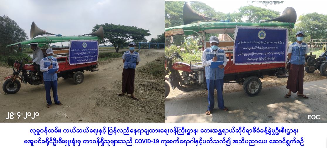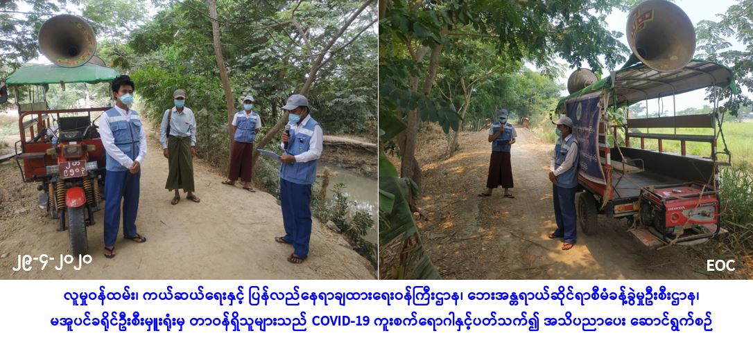 လူမှုဝန်ထမ်း၊ ကယ်ဆယ်ရေးနှင့် ပြန်လည်နေရာချထားရေးဝန်ကြီးဌာန၊ ဘေးအန္တရာယ်ဆိုင်ရာစီမံ ခန့်ခွဲမှုဦးစီးဌာန၊ မအူပင်ခရိုင်ဦးစီးမှူးရုံးမှ တာဝန်ရှိသူများသည် (၂၉-၄-၂၀၂၀) ရက်နေ့တွင် မအူပင်မြို့နယ်၊ အိမ်ယာကြီးကျေးရွာအုပ်စုအတွင်းရှိ ကျေးရွာခွဲ(၃)ရွာ၌ COVID-19 ရောဂါကူးစက်ပျံ့နှံ့မှုများ မဖြစ်ပေါ်စေရန်တွက် အများပြည်သူသိရှိလိုက်နာဆောင်ရွက်ရန်အချက်များအား Loud Speaker, Hand Speaker များဖြင့် လှည့်လည် အသိပညာပေးခြင်းများ ဆောင်ရွက်ခဲ့ကြောင်း သတင်းရရှိပါသည်။