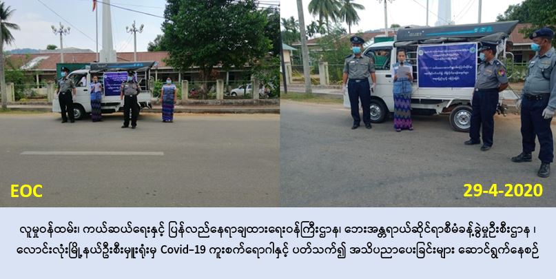 လူမှုဝန်ထမ်း၊ ကယ်ဆယ်ရေးနှင့် ပြန်လည်နေရာချထားရေးဝန်ကြီးဌာန၊ ဘေးအန္တရာယ်ဆိုင်ရာ စီမံခန့်ခွဲမှုဦးစီးဌာန၊ လောင်းလုံးမြို့နယ်ဦးစီးမှူးရုံးမှ တာ၀န်ရှိသူများသည် (၂၉-၄-၂၀၂၀)ရက် နေ့တွင် လောင်းလုံးမြို့နယ်၊ ရဲတပ်ဖွဲ့မှူးရုံးနှင့်ပူးပေါင်း၍ လောင်းလုံးမြို့ပေါ်တွင် ခရီးသွား ပြည်သူများအား Mask များဖြန့်ဝေခြင်း၊ Covid-19 နှင့်ပတ်သက်၍ အသိပညာပေးခြင်းနှင့် တနင်္သာရီတိုင်းဒေသကြီး၊ ထား၀ယ်ခရိုင် ၊ လောင်းလုံးမြို့နယ်၊ ကဒက်ကြီးကျေးရွာ၊ ပြင်ကျောင်း ကျေးရွာ၊ ကြက်ယက်တွင်းကျေးရွာတို့တွင် လော်စပီကာတို့ဖြင့် လတ်တလော အသက်ရှူ လမ်းကြောင်းဆိုင်ရာရောဂါ (Covid-19) ကြိုတင်ကာကွယ်ထိန်းချုပ်နိုင်ရန် အများပြည်သူသို့ အသိပညာပေးပန်ကြားချက်များအား လှည့်လည်ကြေညာခြင်းနှင့် အသိပညာပေး ဗီနိုင်းပိုစတာများ ကပ်ခြင်းတို့ကို ဆောင်ရွက်ခဲ့ကြောင်း သတင်းရရှိပါသည်။