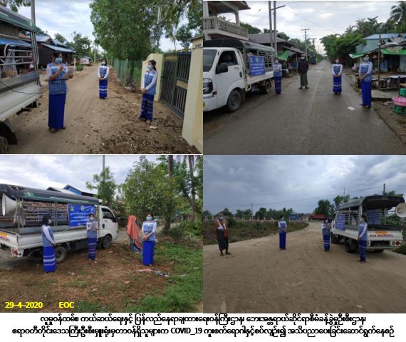 လူမှုဝန်ထမ်း၊ ကယ်ဆယ်ရေးနှင့် ပြန်လည်နေရာချထားရေးဝန်ကြီးဌာန၊ ဘေးအန္တရာယ်ဆိုင်ရာစီမံခန့်ခွဲမှုဉီးစီးဌာန၊ ဧရာဝတီတိုင်းဒေသကြီးဦးစီးမှူးရုံးမှတာဝန်ရှိသူများသည် (၂၉-၄-၂၀၂၀) ရက်နေ့၊ (၁၄:၃၀)နာရီအချိန်မှစတင်၍ ပုသိမ်ခရိုင်၊ ကန်ကြီးထောင့်မြို့နယ်၊ ရှမ်းရွာကျေးရွာအုပ်စု၊ ရှမ်းရွာကျေးရွာရှိ အမှတ်(၁)ရပ်ကွက်၊ အမှတ်(၂)ရပ်ကွက်၊ အမှတ်(၃)ရပ်ကွက်၊ အမှတ်(၄)ရပ်ကွက်၊ အမှတ်(၅)ရပ်ကွက်၊ အမှတ်(၆)ရပ်ကွက်၊ အမှတ်(၇)ရပ်ကွက်တို့၌လည်းကောင်း၊ သူဌေးကုန်းကျေးရွာတို့၌လည်းကောင်း COVID-19 ကူးစက်ရောဂါနှင့်စပ်လျဉ်း၍ ဆောင်ရန်/ရှောင်ရန်အချက်များကို အသိပညာပေးနှိုးဆော်ခဲ့ပါကြောင်း သတင်းရရှိပါသည်။