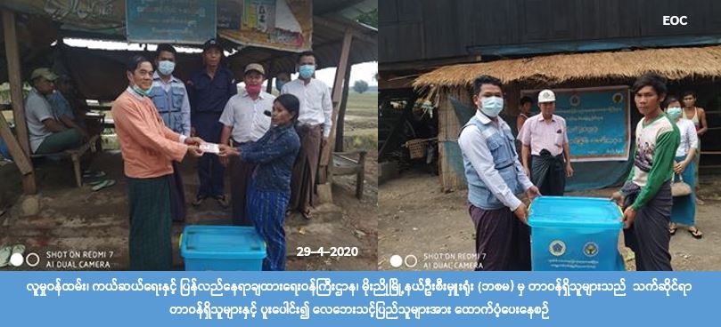 လူမှုဝန်ထမ်း၊ ကယ်ဆယ်ရေးနှင့် ပြန်လည်နေရာချထားရေးဝန်ကြီးဌာန၊ ဘေးအန္တရာယ်ဆိုင်ရာ စီမံခန့်ခွဲမှု ဦးစီးဌာန၊ မိုးညိုမြို့နယ်ဦးစီးမှူးရုံးမှ တာဝန်ရှိသူများသည် (၂၈-၄-၂၀၂၀)ရက်နေ့၊ (၁၇:၀၀)နာရီအချိန်၌ ပဲခူးတိုင်းဒေသကြီး၊ သာယာဝတီခရိုင်၊ မိုးညိုမြို့နယ်၊ ထန်းပင်ကုန်းကျေးရွာအုပ်စု၊ ဥဩတန်းကျေးရွာ၊ အင်းတ္တော်လုပ်ကျေးရွာအုပ်စု၊ ကျေးရွာ(၂)ရွာ၊ တက်ဆွဲကျေးရွာအုပ်စု၊ ကျေးရွာ(၃)ရွာတို့တွင် ဖြစ်ပွားခဲ့ သော လေဘေးကြောင့် ပြိုလဲနေအိမ်(၅)လုံးနှင့် အမိုးလန်နေအိမ်(၃)လုံးတို့အတွက် အိမ်ဆောက် ပစ္စည်းဖိုးထောက်ပံ့ငွေ (၅၄၀,၀၀၀)ကျပ်၊ အိမ်ထောင်စု(၅)စုရှိ လူဦးရေ(၂၇)ဦးတို့အတွက် ဆန်ရိက္ခာဖိုး ထောက်ပံ့ငွေ (၅၆,၇၀၀)ကျပ်၊ စုစုပေါင်းထောက်ပံ့ငွေ (၅၉၆,၇၀၀)ကျပ်၊ ကယ်ဆယ်ရေးပစ္စည်း (၁၆)မျိုး (ပလပ်စတစ်ပုံးအပါ) (၅) အိမ်ထောင်စုစာတို့ကို (၂၉-၄-၂၀၂၀)ရက်နေ့ (၁၄:၃ဝ)နာရီအချိန်တွင် လေဘေး သင့်နေအိမ်၌ မိုးညိုမြို့နယ်အထွေထွေအုပ်ချုပ်ရေးဦးစီးဌာနမှတာဝန်ရှိသူများ၊ အမျိုးသားလွှတ်တော် ကိုယ်စားလှယ်၊ မြို့နယ်မီးသတ်တပ်ဖွဲ့ဝင်များ၊ ကျေးရွာအုပ်ချုပ်ရေးမှူးနှင့်အတူ ပြည်သူလက်ဝယ် အရောက် သွားရောက်ထောက်ပံ့ပေးခဲ့ကြောင်း သိရှိရပါသည်။
