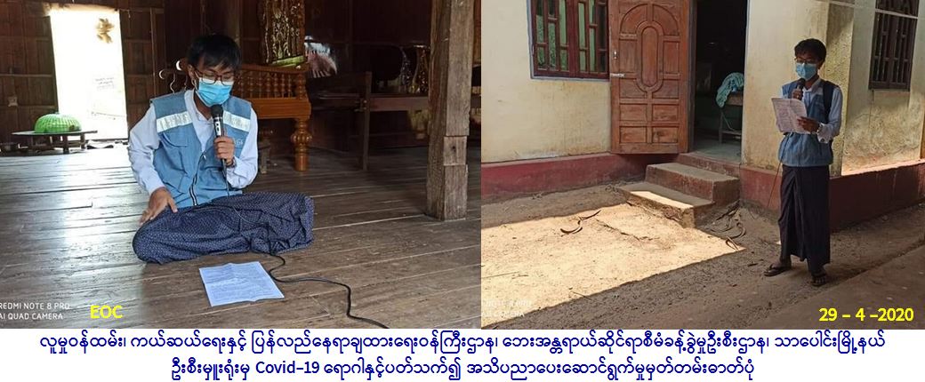 လူမှုဝန်ထမ်း၊ ကယ်ဆယ်ရေးနှင့်ပြန်လည်နေရာချထားရေးဝန်ကြီးဌာန၊ ဘေးအန္တရာယ်ဆိုင်ရာစီမံခန့်ခွဲမှုဦးစီးဌာန၊ သာပေါင်း မြို့နယ်ဦးစီးမှူးရုံးမှ တာဝန်ရှိသူများသည် ပုသိမ်ခရိုင်၊ သာပေါင်းမြို့နယ်၊ ကွင်းကောက်ကျေးရွာအုပ်စု၊ ကွင်းကောက်ကျေးရွာ၊ အိုးဘိုကျေးရွာနှင့် ဘောတလင်းကုန်းကျေးရွာတို့၌ ကျေးရွာအုပ်စု အုပ်ချုပ်ရေးမှူး၊ ရပ်မိရပ်ဖများ၊ ကျေးရွာရှိတာ၀န်ရှိသူများနှင့် အတူ (၂၉-၄-၂၀၂၀) ရက်နေ့၌ (၁၂:၀၀)နာရီအချိန်တွင် လက်တလော နိုင်ငံအသီးသီးတွင် ကူးစက်ပြန့်ပွားလျက်ရှိသော COVID-19 ကူးစက်ရောဂါနှင့်ပတ်သက်ပြီး ဆောင်ရန်/ရှောင်ရန် များကို ကျေးရွာ/ရပ်ကွက်နေပြည်သူတို့အား အသိပညာပေးဟောပြော ဆောင်ရွက်ခဲ့ပါကြောင်း သတင်းရရှိပါသည်။