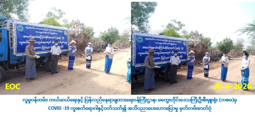 လူမှုဝန်ထမ်း၊ ကယ်ဆယ်ရေးနှင့် ပြန်လည်နေရာချထားရေးဝန်ကြီးဌာန၊ ဘေးအန္တရာယ်ဆိုင်ရာစီမံ ခန့်ခွဲမှုဉီးစီးဌာန၊ မကွေးတိုင်းဒေသကြီးဦးစီးမှူးရုံးမှ တာဝန်ရှိသူများသည် (၃၀-၄-၂၀၂၀) ရက်နေ့၊ နံနက် (၀၇:၀၀)အချိန်မှ စတင်ပြီး မကွေးမြို့နယ်၊ သမန်းတောကျေးရွာ(တောင်)၊ သမန်းတောကျေးရွာ (မြောက်)နှင့် ပုတီးကုန်းကျေးရွာများသို့လှည့်လည်ပြီး COVID -19 ကူးစက်ရောဂါနှင့်ပတ်သက်ပြီး ဆောင်ရန်/ ရှောင်ရန် တို့ကို ရပ်ကွက်အုပ်ချုပ်ရေးမှူးများ၊ လူမှုဝန်ထမ်းဦးစီးဌာနတို့နှင့်အတူ ပူးပေါင်း၍ ရပ်ကွက်/ ကျေးရွာနေပြည်သူတို့အား အသိပညာပေးဟောပြောဆောင်ရွက်ခဲ့ကြောင်း သတင်းရရှိပါသည်။