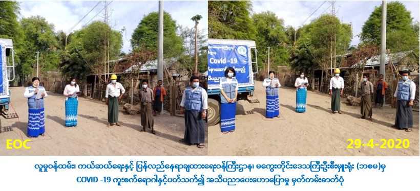 လူမှုဝန်ထမ်း၊ ကယ်ဆယ်ရေးနှင့် ပြန်လည်နေရာချထားရေးဝန်ကြီးဌာန၊ ဘေးအန္တရာယ်ဆိုင်ရာစီမံ ခန့်ခွဲမှုဦးစီးဌာန၊ မကွေးတိုင်းဒေသကြီးဦးစီးမှူးရုံးမှ တာဝန်ရှိသူများသည် (၂၉-၄-၂၀၂၀) ရက်နေ့ နံနက်(၀၇:၀၀)အချိန်မှ စတင်ပြီး နတ်မောက်မြို့နယ်၊ ဘုန်းတော်ပြည့်ကျေးရွာ၊ လက်ပံတုန်းကျေးရွာ၊ အိုးဘိုကျေးရွာများသို့လှည့်လည်ပြီး COVID-19 ကူးစက်ရောဂါနှင့်ပတ်သက်ပြီး ဆောင်ရန်/ရှောင်ရန် တို့ကို ရပ်ကွက်အုပ်ချုပ်ရေးမှူးများ၊ လူမှုဝန်ထမ်းဦးစီးဌာန တို့နှင့်အတူ ပူးပေါင်း၍ ရပ်ကွက်/ ကျေးရွာ နေပြည်သူတို့အား အသိပညာပေးဟောပြောဆောင်ရွက်ခဲ့ကြောင်း သတင်းရရှိပါသည်။
